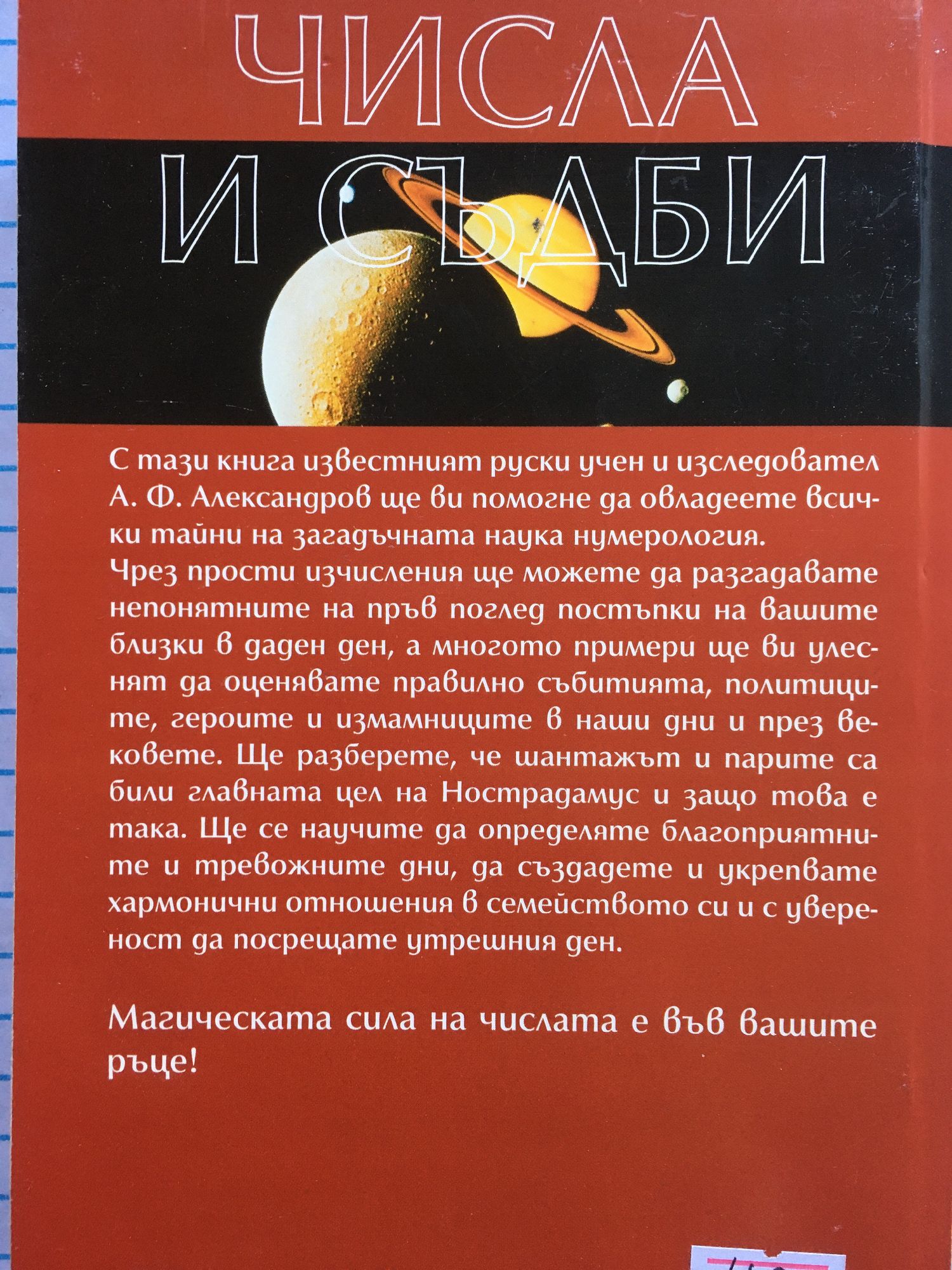 С тази книга известният руски учен и изследовател А. Ф. Александров ще ви помогне да овладеете всички тайни на загадъчната наука нумерология! Чрез прости изчисления ще можете да разгадавате непонятните на пръв поглед постъпки на вашите близки в даден ден, а многото примери ще ви улеснят да оценявате правилно събитията, политиците, героите и измамниците в наши дни и през вековете... Ще разберете тапример, че шантажът и парите са били главната цел на Нострадамус и защо това е така. Ще се научите да определяте благоприятните и тревожните дни, да създадете и укрепвате хармонични отношения в семейството си и с увереност да посрещате утрешния ден. Магическата сила на числата е във вашите ръце!
