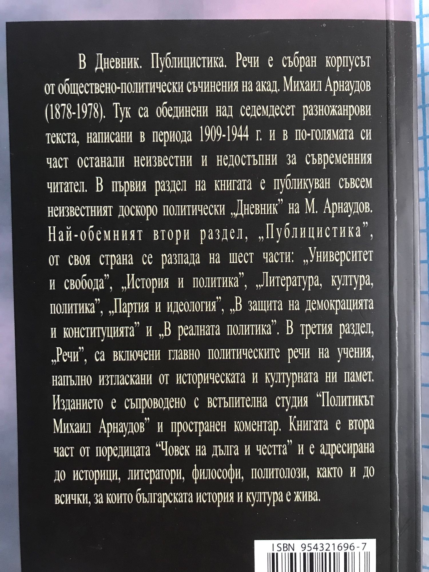 В “Дневник. Публицистика. Речи” е събран корпусът от обществено-политически съчинения на акад. Михаил Арнаудов (1878–1978). Тук са обединени над седемдесет разножанрови текста: дневник, статии, есета, публични изявления, интервюта, некролози, надгробни слова, фрагменти, речи и беседи, написани в периода 1909–1944 г. и почти напълно непознати и недостъпни за съвременния читател. В първия раздел на книгата е публикуван съвсем неизвестният доскоро политически „Дневник“ на М. Арнаудов. Най-обемният втори раздел, „Публицистика“, от своя страна се разпада на шест части: „Университет и свобода“, „История и политика“, „Литература, култура, политика“, „Партия и идеология“, „В защита на демокрацията и конституцията“ и „В реалната политика“. В третия раздел, „Речи“, са включени главно политическите речи на учения, напълно изтласкани от историческата и културната ни памет. Изданието, пример за хуманитарна „археология“, е съпроводено с встъпителна студия „Политикът Михаил Арнаудов“ и пространен коментар. Книгата е втора част от поредицата „Човек на дълга и честта“ и е адресирана до историци, литератори, философи, политолози, както и до всички, за които българската история и култура е жива.