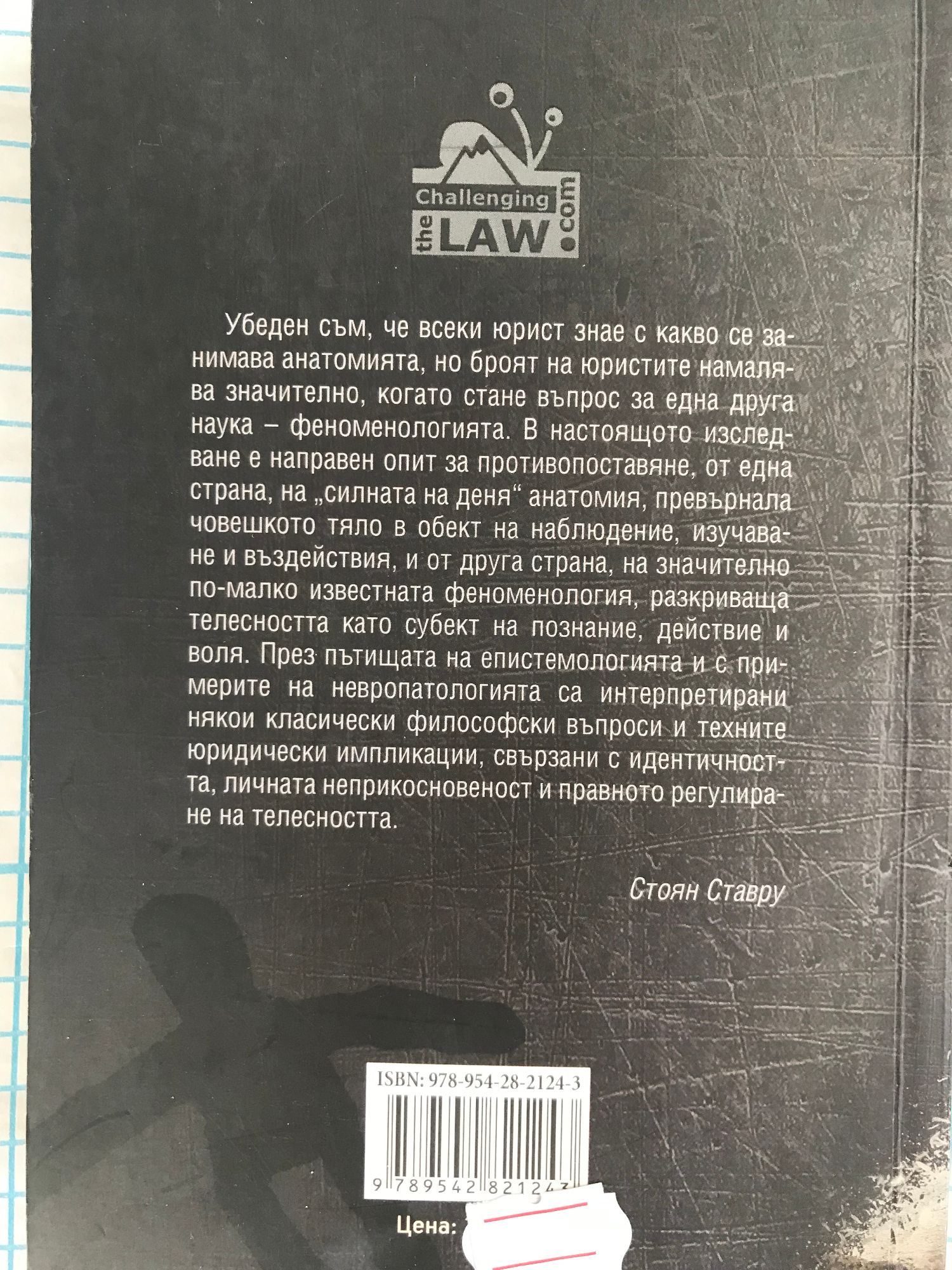 "Убеден съм, че всеки юрист знае с какво се занимава анатомията, но броят на юристите намалява значително, когато стане въпрос за една друга наука - феноменологията. В настоящото изследване е направен опит за противопоставяне, от една страна, на "силната на деня" анатомия, превърнала човешкото тяло в обект на наблюдение, изучаване и въздействия, и от друга страна, на значително по-малко известната феноменология, разкриваща телесността като субект на познание, действие и воля. През пътищата на епистемологията и с примерите на невропатологията са интерпретирани някои класически философски въпроси и техните юридически импликации, свързани с идентичността, личната неприкосновеност и правното регулиране на телесността."