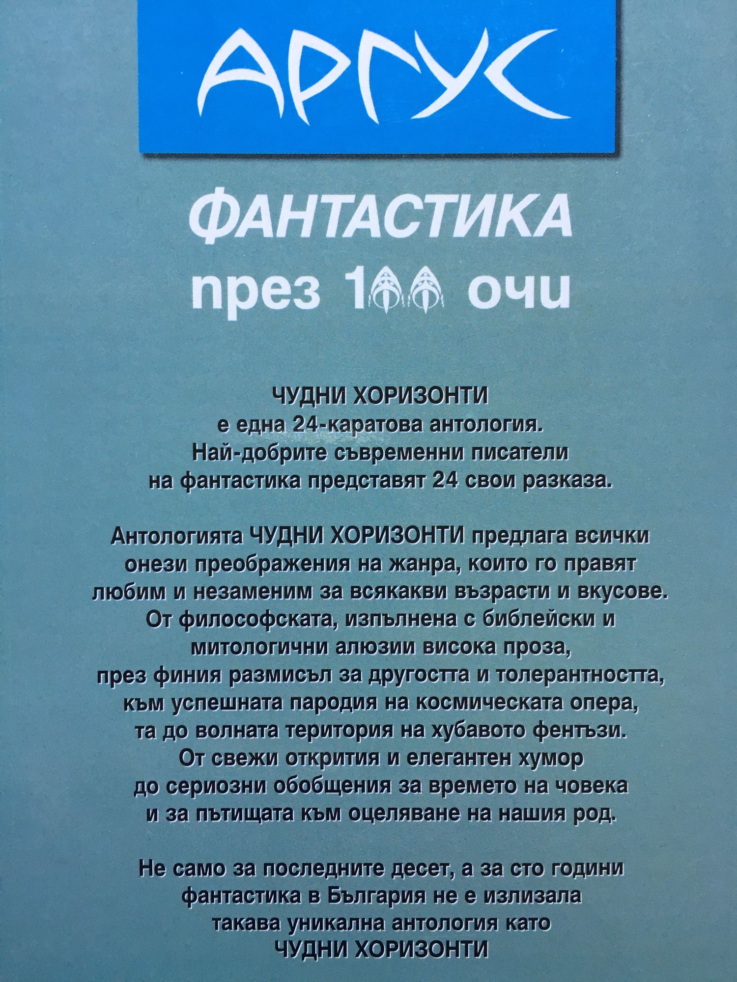 „Чудни хоризонти“ е една 24-каратова антология. Най-добрите съвременни писатели на фантастика представят 24 свои разказа. Антологията „Чудни хоризонти“ предлага всички онези преображения на жанра, които го правят любим и незаменим за всякакви възрасти и вкусове. От философската, изпълнена с библейски и митологични алюзии висока проза, през финия размисъл за другостта и толерантността, към успешната пародия на космическата опера, та до волната територия на хубавото фентъзи. От свежи открития и елегантен хумор до сериозни обобщения за времето на човека и за пътищата към оцеляване на нашия род. Не само за последните десет, а за сто години фантастика в България не е излизала такава уникална антология като „Чудни хоризонти“.