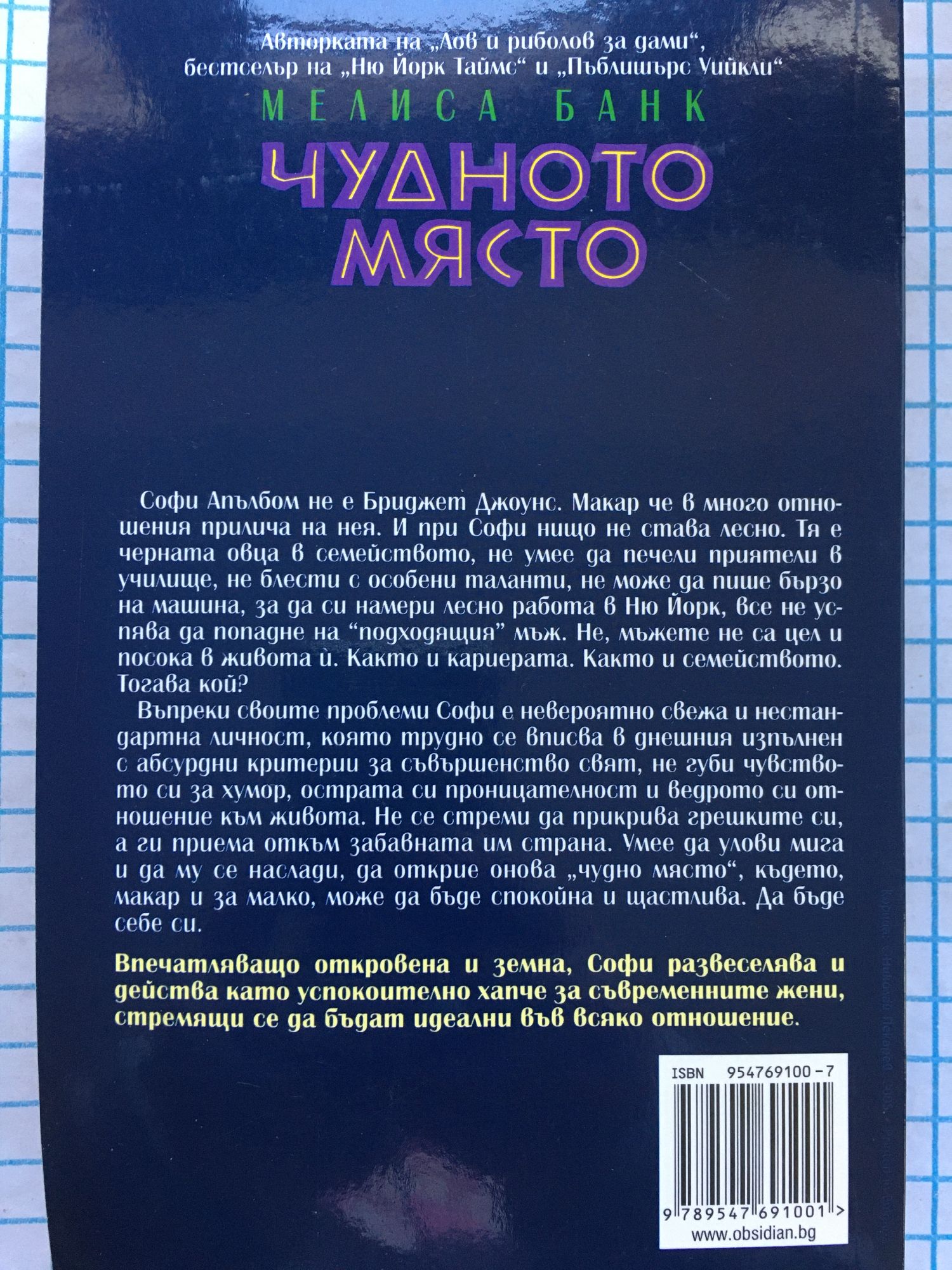 Софи Апълбом не е Бриджет Джоунс. Макар че в много отношения прилича на нея. И при Софи нищо не става лесно. Тя е черната овца в семейството, не умее да печели приятели в училище, не блести с особени таланти, не може да пише бързо на машина, за да си намери лесно работа в Ню Йорк, все не успява да попадне на "подходящия" мъж. Не, мъжете не са цел и посока в живота п. Както и кариерата. Както и семейството. Тогава кой? Въпреки своите проблеми Софи е невероятно свежа и нестандартна личност, която трудно се вписва в днешния изпълнен с абсурдни критерии за съвършенство свят, не губи чувството си за хумор, острата си проницателност и ведрото си отношение към живота. Не се стреми да прикрива грешките си, а ги приема откъм забавната им страна. Умее да улови мига и да му се наслади, да открие онова „чудно място", където, макар и за малко, може да бъде спокойна и щастлива. Да бъде себе си. Впечатляващо откровена и земна, Софи развеселява и действа като успокоително хапче за съвременните жени, стремящи се да бъдат идеални във всяко отношение.