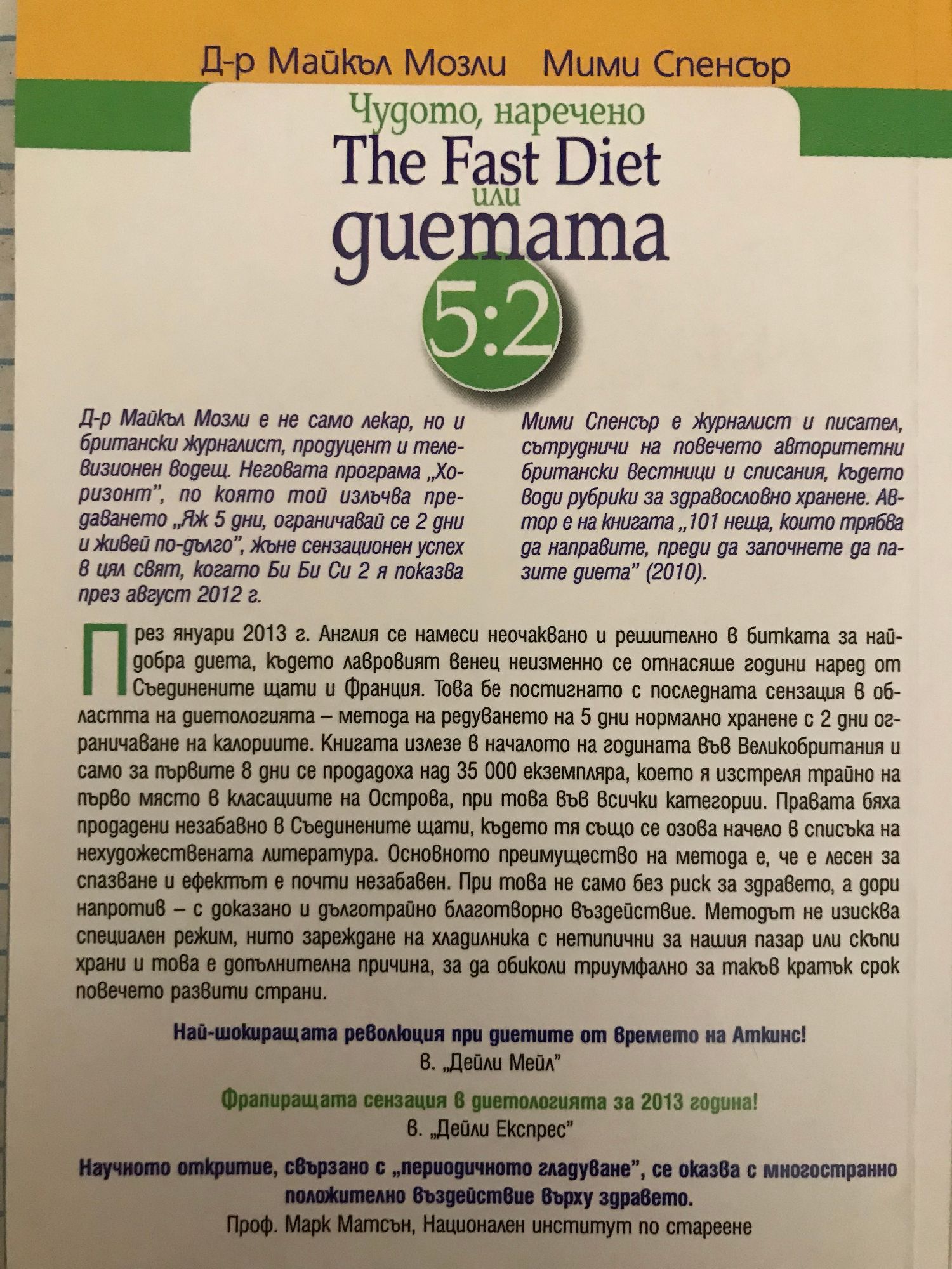През януари 2013 г. Англия се намеси неочаквано и решително в битката за най-добра диета, където лавровият венец неизменно се отнасяше години наред от Съединените щати и Франция. Това бе постигнато с последната сензация в областта на диетологията – метода на редуването на 5 дни нормално хранене с 2 дни ограничаване на калориите. Книгата излезе в началото на годината във Великобритания и само за първите 8 дни се продадоха над 35 000 екземпляра, което я изстреля трайно на първо място в класациите на Острова, при това във всички категории. Правата бяха продадени незабавно в Съединените щати, където тя също се озова начело в списъка на нехудожествената литература. Основното преимущество на метода е, че е лесен за спазване и ефектът е почти незабавен. При това не само без риск за здравето, а дори напротив – с доказано и дълготрайно благотворно въздействие. Методът не изисква специален режим, нито зареждане на хладилника с нетипични за нашия пазар или скъпи храни и това е допълнителна причина, за да обиколи триумфално за такъв кратък срок повечето развити страни. Най-шокиращата революция при диетите от времето на Аткинс! в. „Дейли Мейл” Абсолютна сензация в диетологията за 2013 година! в. „Дейли Експрес” Научното откритие, свързано с „периодичното гладуване”, се оказва с многостранно положително въздействие върху здравето. Проф. Марк Матсън, Национален институт по стареене