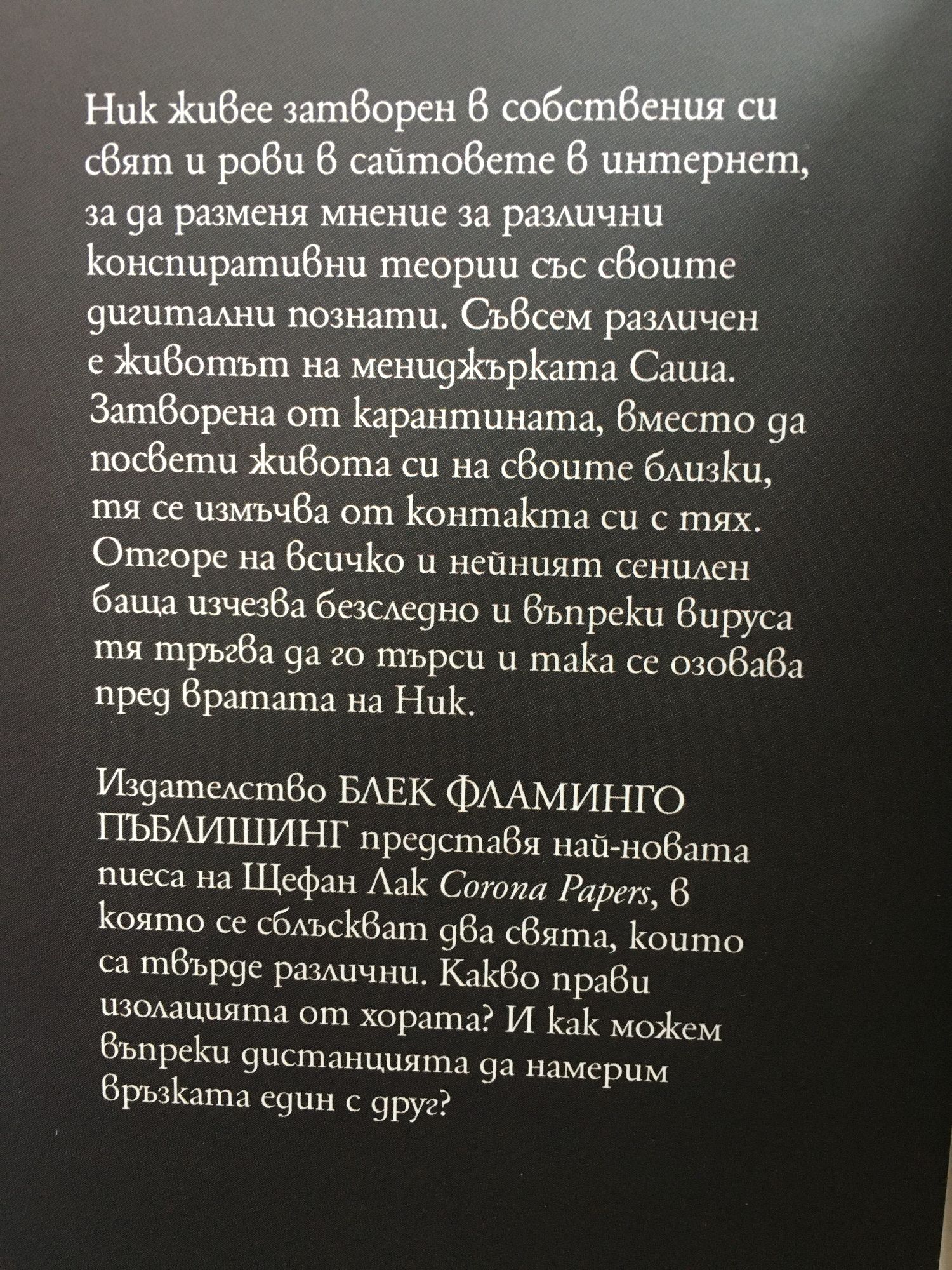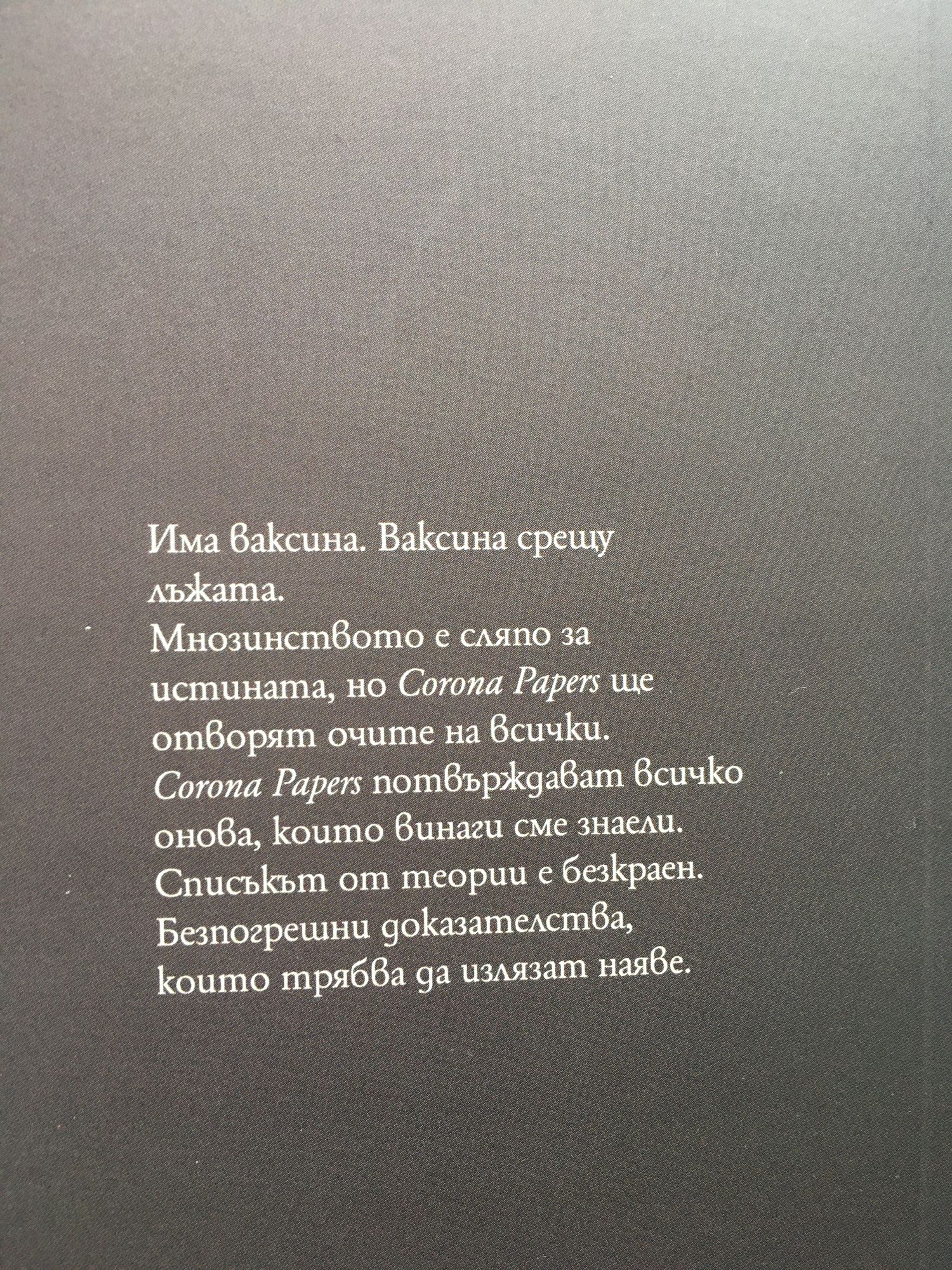 Има ваксина. Ваксина срещу лъжата. Мнозинството е сляпо за истината, но Corona Papers ще отворят очите на всички. Corona Papers потвърждава всичко онова, което винаги сме знаели. Списъкът от теории е безкраен. Безпогрешни доказателства, които трябва да излязат наяве. Щефан Лак е роден през 1981 г. във Виена. Учи публицистика и театрознание. Още първата му пиеса "Затрупан", написана през 2004 г. е наградена и поставена през следващата година. Това го вдъхновява и той е вече автор на няколко театрални пиеси, които се посрещат с голям интерес. Най-големият му успех е през 2011 г., когато неговата пиеса "Състоянието на плажовете" за престъпленията на хората спрямо природата е поставена в театъра в Хайделберг и е представена на Пазара за нови драматургични текстове там.
