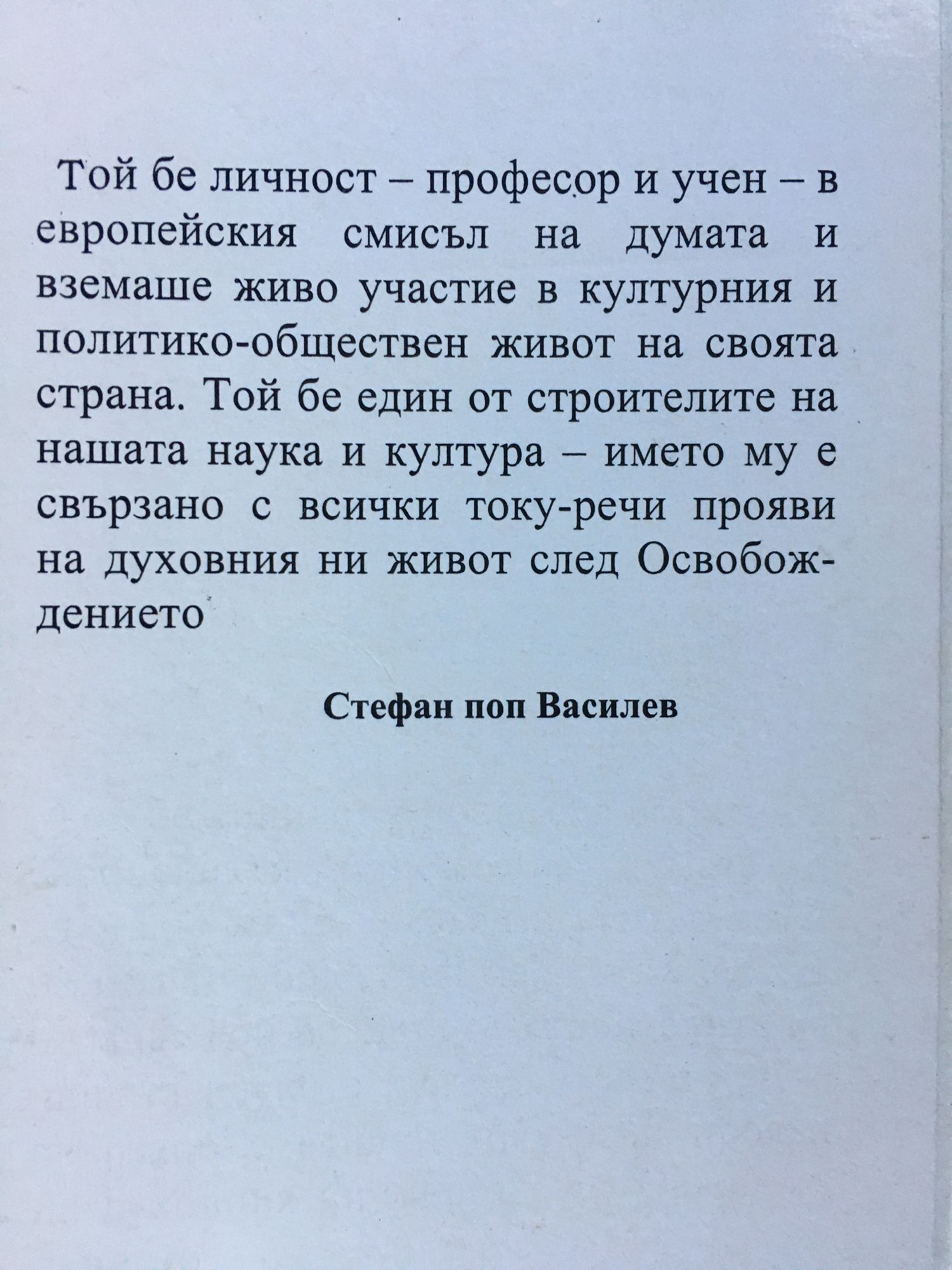 Той бе личност - професор и учен -- в европейския смисъл на думата и вземаше живо участие в културния и политико-обществен живот на своята страна. Той бе един от строителите на нашата наука и култура - името му е свързано с всички току-речи прояви на духовния ни живот след Освобождението Стефан поп Василев