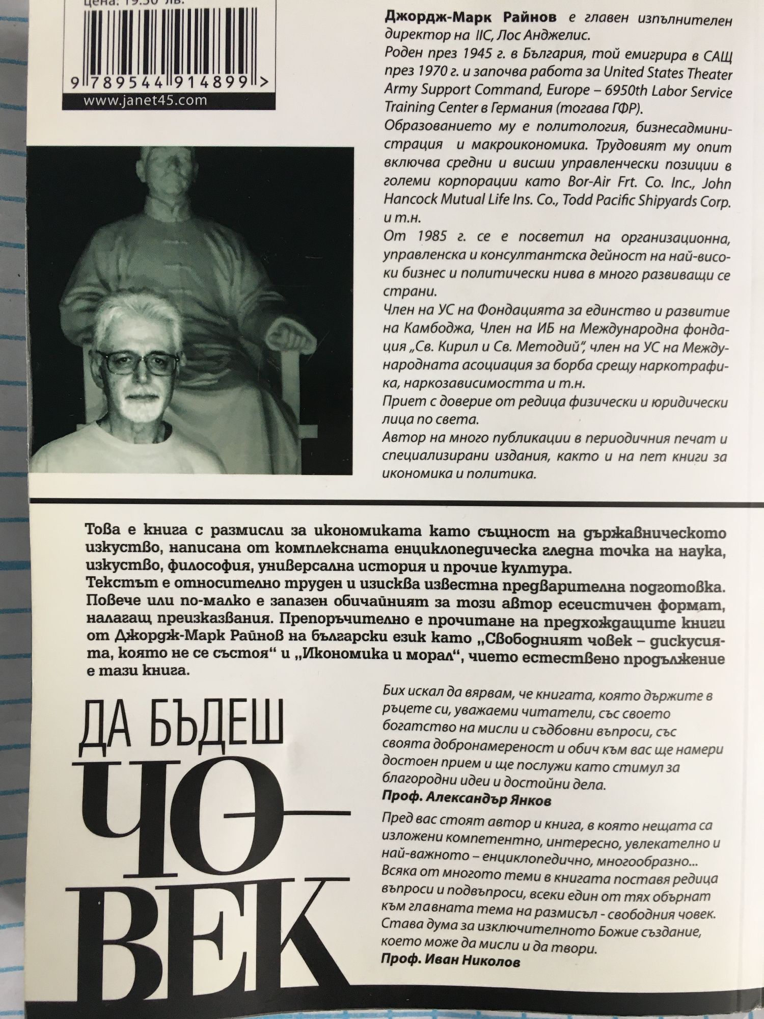 Това е книга с размисли за икономиката като същност на държавническото изкуство, написана от комплексната енциклопедическа гледна точка на наука, изкуство, философия, универсална история и прочие култура. Текстът е относително труден и изисква известна предварителна подготовка. Повече или по-малко е запазен обичайният за този автор есеистичен формат, налагащ преизказвания. Препоръчително е прочитане на предхождащите книги от Джордж-Марк Райнов на български език като "Свободният човек – дискусията, която не се състоя" и "Икономика и морал", чието естествено продължение е тази книга. "Бих искал да вярвам, че книгата, която държите в ръцете си, уважаеми читателю, със своето богатство на мисли и съдбовни въпроси, със своята добронамереност и обич към Вас ще намери достоен прием и ще послужи като стимул за благородни идеи и достойни дела." Проф. Александър Янков Пред вас стоят автор и книга, в която нещата са изложени компетентно, интересно и увлекателно и най-важното – енциклопедично, многообразно. Темите са толкова много и стават още по-много, тъй като всяка тема има множество подтеми, които са безкрайност от въпроси и подвъпроси и всеки един може да се разглежда като "тема на размисъл на свободния човек"... Джордж-Марк Райнов е главен изпълнителен директор на IIC, Лос Анджелис. Роден през 1945 г. в София, той емигрира в САЩ през 1970 г. и започва работа за United States Theater Army Support Command, Europe – 6950th Labor Service Training Center в Германия (тогава ГФР). Специализира политически науки, бизнес администрация и макроикономика. Трудовият му опит включва средно и висши управленски позиции в големи корпорации като Bor-Air Frt. Co. Inc., John Hancock Mutual Life Ins. Co., Todd Pacific Shipyards Corp. и т.н. От 1985 г. се е посветил на организационна, управленска и консултантска дейност на най-високо бизнес и политическо равнище в редица развиващи се държави. Член е на управителния съвет на "Фондацията за единство и развитие на Камбоджа", както и на изпълнителното бюро на международната фондация "Св. Кирил и Св. Методий", той е част от управителния съвет на "Международната асоциация за борба срещу наркотрафика и наркозависимостта". Автор на многобройни публикации в периодичния печат, както и на пет книги за икономика и политика.