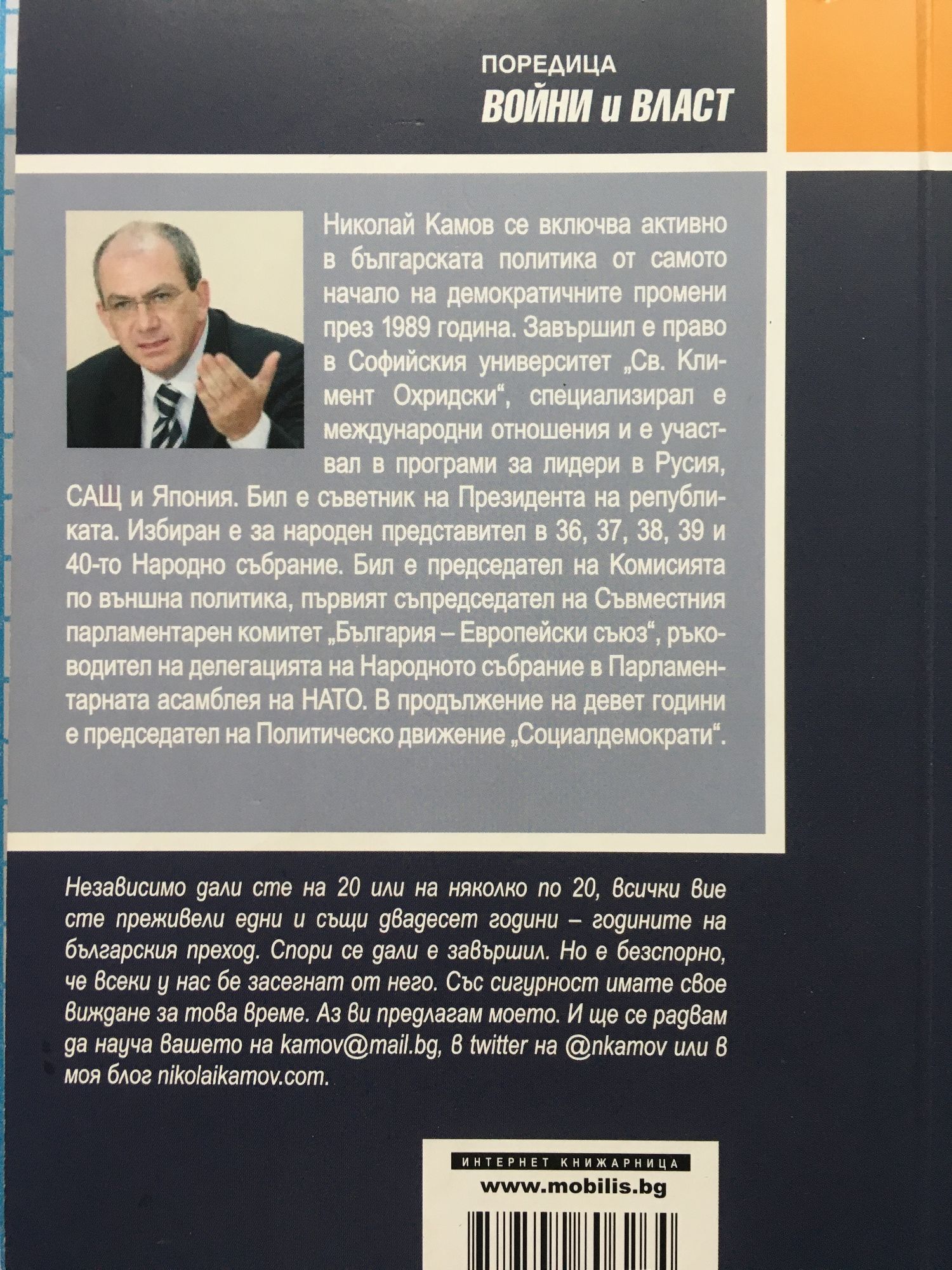 Независимо дали сте на 20 или на няколко по 20, всички вие сте преживели едни и същи двадесет години – годините на българския преход. Спори се дали е завършил. Но е безспорно, че всеки у нас бе засегнат от него. Със сигурност имате свое виждане за това време. Аз ви предлагам моето. Николай Камов се включва активно в българската политика от самото начало на демократичните промени през 1989 година. Завършил е право в СУ "Св. Климент Охридски", специализирал е международни отношения и е участвам в програми за лидери в Русия, САЩ и Япония. Бил е съветник на Президента на републиката. Избиран е за народен представител в 36, 37, 38, 39 и 40-то Народно събрание. Бил е председател на Комисията по външна политика, първият съпредседател на Съвместния парламентарен комитет "България - Европейски съюз", ръководил е делегацията на Народното събрание в Парламентарната асамблея на НАТО. В продължение на девет години е председател на политическо движение "Социалдемократи".