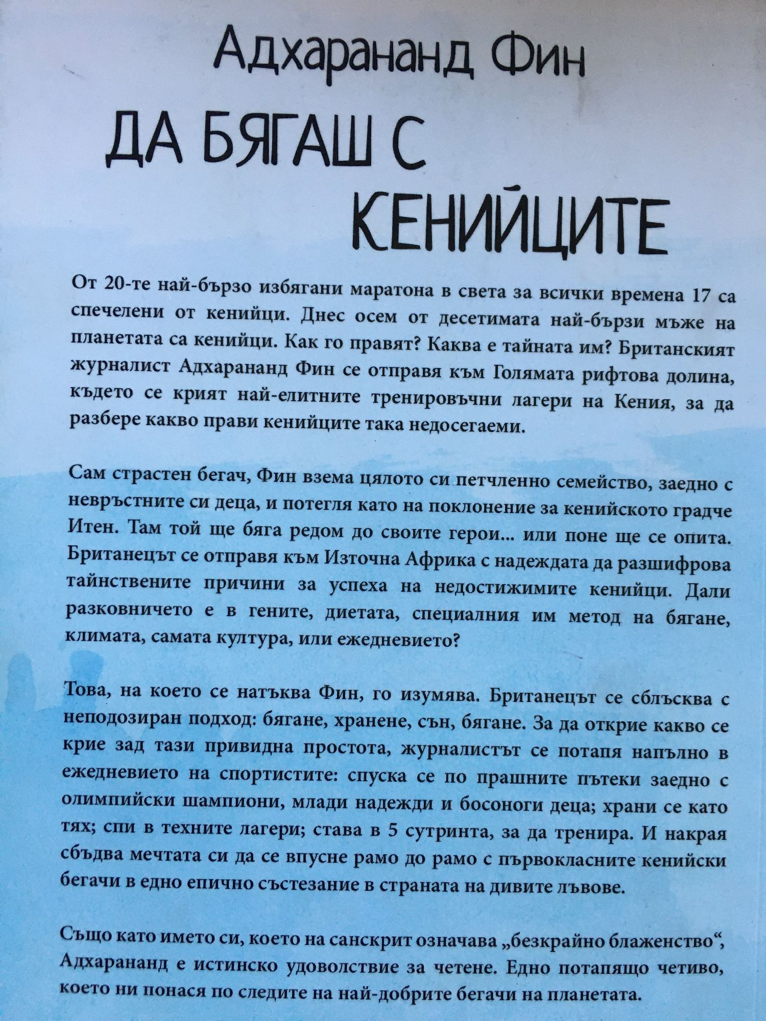 Адхарананд Фин бяга в КенияОт 20-те най-бързо избягани маратона в света за всички времена 17 са спечелени от кенийци. Днес осем от десетимата най-бързи мъже на планетата са кенийци. Как го правят? Каква е тайната им? Британският журналист Адхарананд Фин се отправя към Голямата рифтова долина, където се крият най-елитните тренировъчни лагери на Кения, за да разбере какво прави кенийците така недосегаеми. Сам страстен бегач, Фин взема цялото си петчленно семейство, заедно с невръстните си деца, и потегля като на поклонение за кенийското градче Итен. Там той ще бяга редом до своите герои… или поне ще се опита. Британецът се отправя към Източна Африка с надеждата да разшифрова тайнствените причини за успеха на недостижимите кенийци. Дали разковничето е в гените, диетата, специалния им метод на бягане, климата, самата култура, или ежедневието? Това, на което се натъква Фин, го изумява. Британецът се сблъсква с неподозиран подход: бягане, хранене, сън, бягане. За да открие какво се крие зад тази привидна простота, журналистът се потапя напълно в ежедневието на спортистите: спуска се по прашните пътеки заедно с олимпийски шампиони, млади надежди и босоноги деца; храни се като тях; спи в техните лагери; става в 5 сутринта, за да тренира. И накрая сбъдва мечтата си да се впусне рамо до рамо с първокласните кенийски бегачи в едно епично състезание в страната на дивите лъвове.