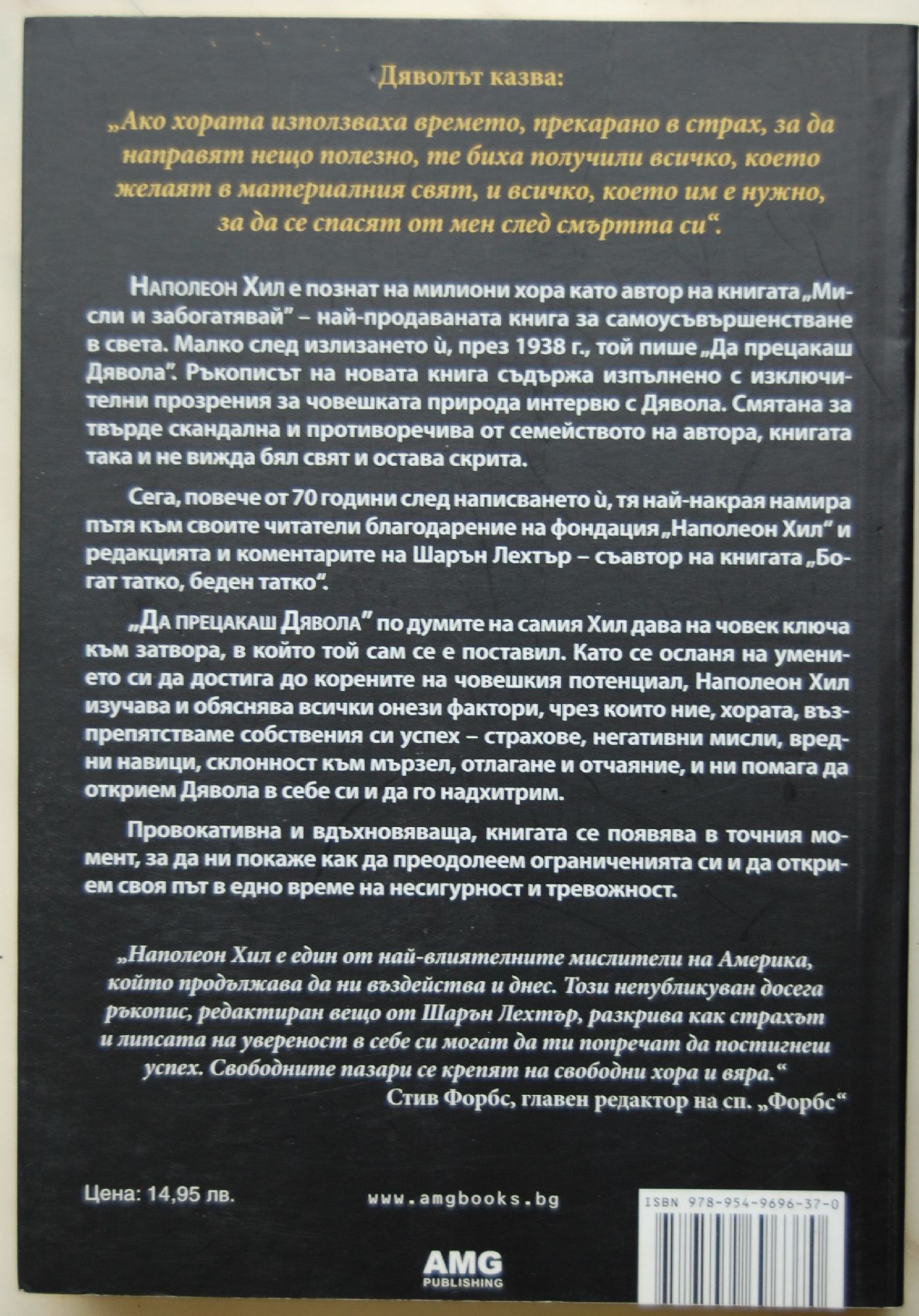 Наполеон Хил e познат на милиони хора като автор на книгата „Мисли и забогатявай” – най-продаваната книга за самоусъвършенстване в света. Малко след излизането й, през 1938 г., той пише „Да прецакаш Дявола”. Ръкописът на новата книга съдържа изпълнено с изключителни прозрения за човешката природа интервю с Дявола. Смятана за твърде скандална и противоречива от семейството на автора, книгата така и не вижда бял свят и остава скрита. Сега, повече от 70 години след написването й, тя най-накрая намира пътя към своите читатели благодарение на фондация „Наполеон Хил” и редакцията и коментарите на Шарън Лехтър – съавтор на книгата „Богат татко, беден татко”. „Да прецакаш Дявола”, по думите на самия Хил, дава на човек ключа към затвора, в който той сам се е поставил. Основната й ценност е, че тя очертава разликата между човека, който се носи по течението на живота без цел и посока, и онзи, който използва най-ценния си ресурс – своя ум, за да управлява живота си и да постига целите си. Както бизнес консултантът Брайън Трейси правилно отбелязва, ако „Мисли и забогатявай“ е картата по пътя към успеха, то „Да прецакаш Дявола“ ще помогне на хората да се освободят от бариерите, които вероятно им пречат да постигнат този успех. Наполеон Хил е човек, който знае как да накара другите да се замислят. Затова той веднага ни въвлича в приключението – превежда ни през своя собствен живот и споделя за два повратни момента в него. Това са периоди на личностни кризи, объркване и безпътица, оказали се впоследствие решаващи за неговите бъдещи успехи, тъй като илюстрират неизменен житейски принцип: „Причината за успеха не е нещо отделно и външно от самия човек. Тя е сила, толкова неуловима, че повечето хора не я различават; сила, която спокойно може да бъде наречена „другото ни Аз“. Забележителното е, че тази сила се проявява и става видима много рядко – само при изключителни обстоятелства, когато хората са били принудени – след преживяване на голяма беда или временен провал – да променят нагласите си и да мислят по начин, който да им помогне да излязат от затруднено положение”.