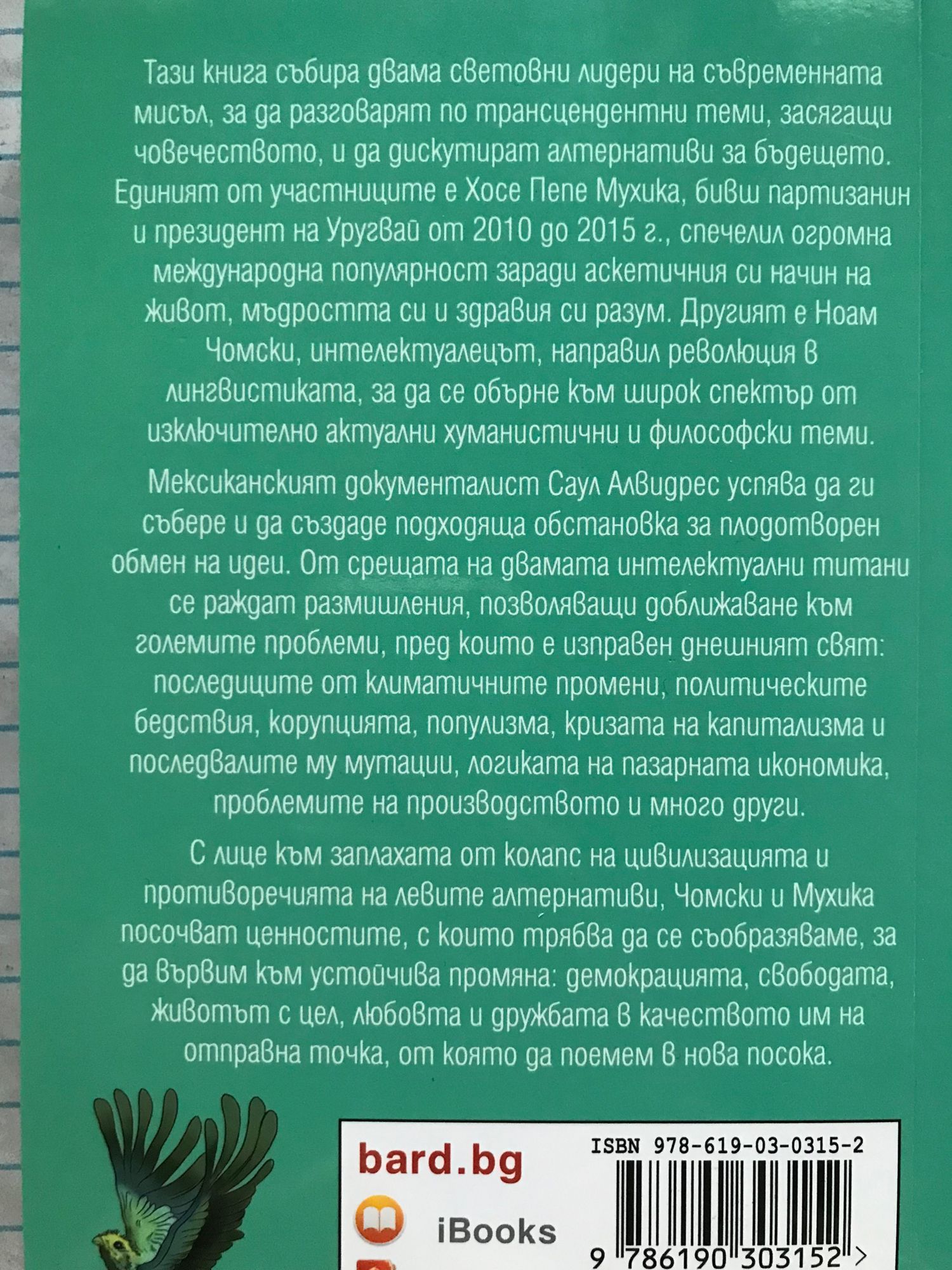 Тази книга събира двама световни лидери на съвременната мисъл, за да разговарят по трансцендентни теми, засягащи човечеството, и да дискутират алтернативи за бъдещето. Единият от участниците е Хосе Пепе Мухика, бивш партизанин и президент на Уругвай от 2010 до 2015 г., спечелил огромна международна популярност заради аскетичния си начин на живот, мъдростта си и здравия си разум. Другият е Ноам Чомски, интелектуалецът, направил революция в лингвистиката, за да се обърне към широк спектър от изключително актуални хуманистични и философски теми. Мексиканският документалист Саул Алвидрес успява да ги събере и да създаде подходяща обстановка за плодотворен обмен на идеи. От срещата на двамата интелектуални титани се раждат размишления, позволяващи доближаване към големите проблеми, пред които е изправен днешният свят: последиците от климатичните промени, политическите бедствия, корупцията, популизма, кризата на капитализма и последвалите му мутации, логиката на пазарната икономика, проблемите на производството и много други. С лице към заплахата от колапс на цивилизацията и противоречията на левите алтернативи, Чомски и Мухика посочват ценностите, с които трябва да се съобразяваме, за да вървим към устойчива промяна: демокрацията, свободата, животът с цел, любовта и дружбата в качеството им на отправна точка, от която да поемем в нова посока.