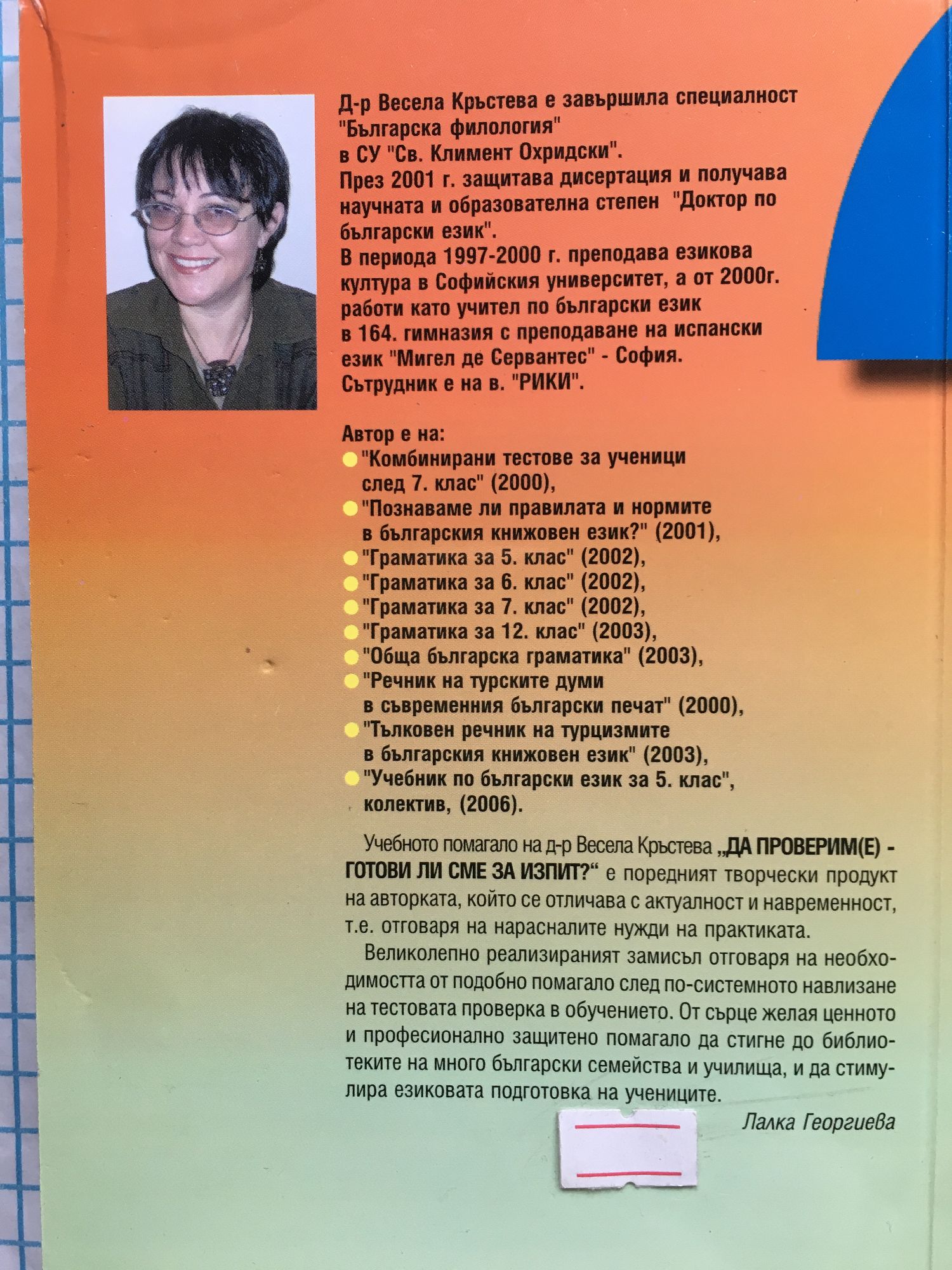 Учебното помагало на д-р Весела Кръстева е поредният творчески продукт на авторката, който се отличава с актуалност и навременност, т.е. отговаря на нарасналите нужди на практиката. Великолепно реализирания замисъл отговаря на необходимостта от подобно помагало след по-системното навлизане на тестовата проверка в обучението.