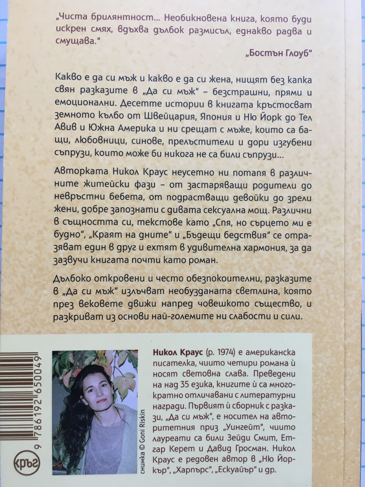 Какво е да си мъж и какво е да си жена, нищят без капка свян разказите в „Да си мъж“ – безстрашни, прями и емоционални. Десетте истории в книгата кръстосват земното кълбо от Швейцария, Япония и Ню Йорк до Тел Авив и Южна Америка и ни срещат с мъже, които са бащи, любовници, синове, прелъстители и дори изгубени съпрузи, които може би никога не са били съпрузи... Авторката Никол Краус неусетно ни потапя в различните житейски фази – от застаряващи родители до невръстни бебета, от подрастващи девойки до зрели жени, добре запознати с дивата сексуална мощ. Различни в същността си, текстове като „Спя, но сърцето ми е будно“, „Краят на дните“ и „Бъдещи бедствия“ се отразяват един в друг и ехтят в удивителна хармония, за да зазвучи книгата почти като роман. Дълбоко откровени и често обезпокоителни, разказите в „Да си мъж“ излъчват необузданата светлина, която през вековете движи напред човешкото същество, и разкриват из основи най-големите ни слабости и сили. „Чиста брилянтност... Необикновена книга, която буди искрен смях, вдъхва дълбок размисъл, еднакво радва и смущава.“ „Бостън Глоуб“
