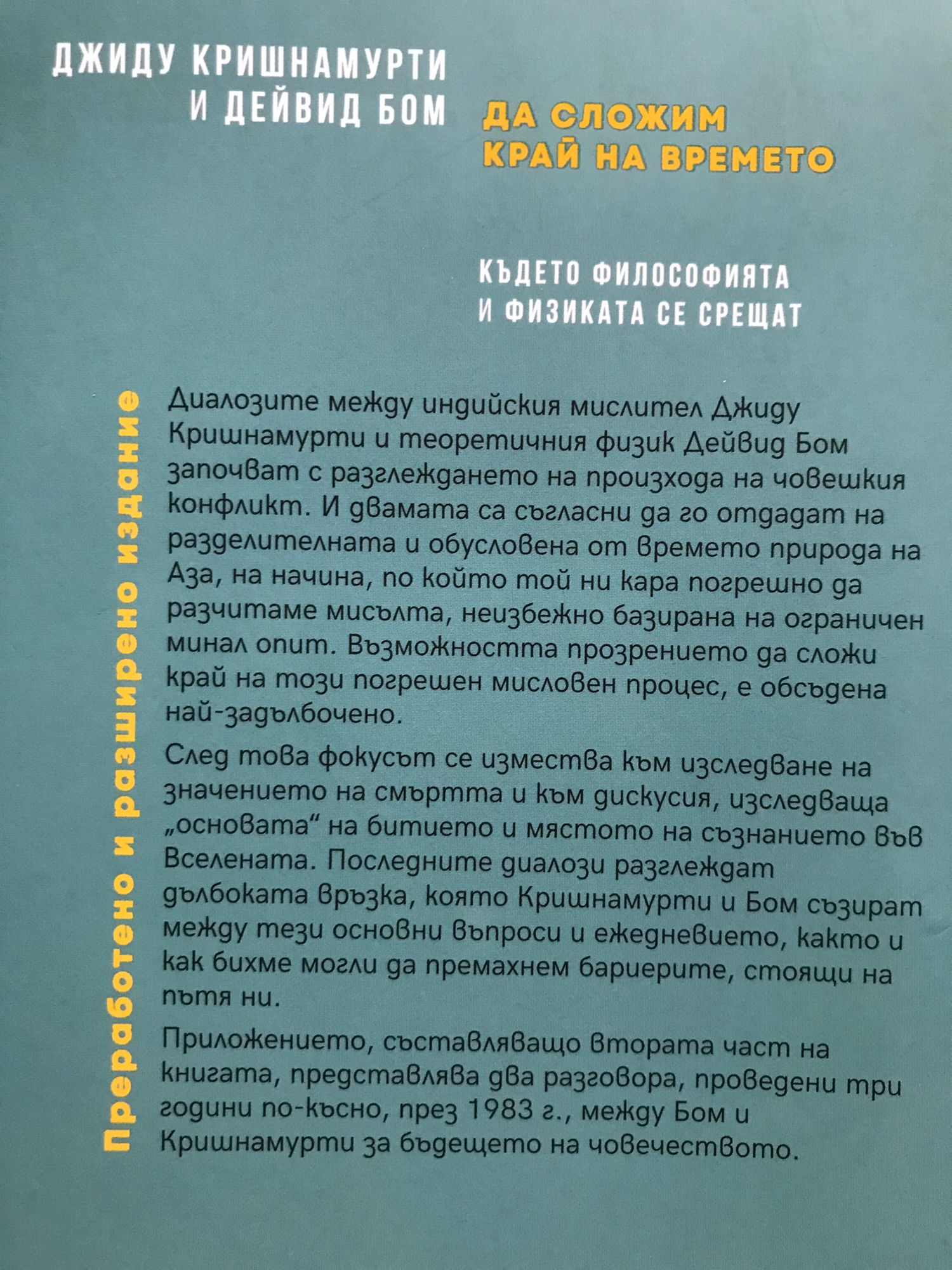 Диалозите между индийския мислител Джиду Кришнамурти и теоретичния физик Дейвид Бом започват с разглеждането на произхода на човешкия конфликт. И двамата са съгласни да го отдадат на разделителната и обусловена от времето природа на Aза, на начина, по който той ни кара погрешно да разчитаме мисълта, неизбежно базирана на ограничен минал опит. Възможността прозрението да сложи край на този погрешен мисловен процес, е обсъдена най-задълбочено. След това фокусът се измества към изследване на значението на смъртта и към дискусия, изследваща „основата“ на битието и мястото на съзнанието във Вселената. Последните диалози разглеждат дълбоката връзка, която Кришнамурти и Бом съзират между тези основни въпроси и ежедневието, както и как бихме могли да премахнем бариерите, стоящи на пътя ни. Приложението, съставляващо втората част на книгата, представлява два разговора, проведени три години по-късно, през 1983 г., между Бом и Кришнамурти за бъдещето на човечеството. Разговорите изследват връзките, развити в някои от ключовите моменти в диалозите от „Да сложим край на времето“.