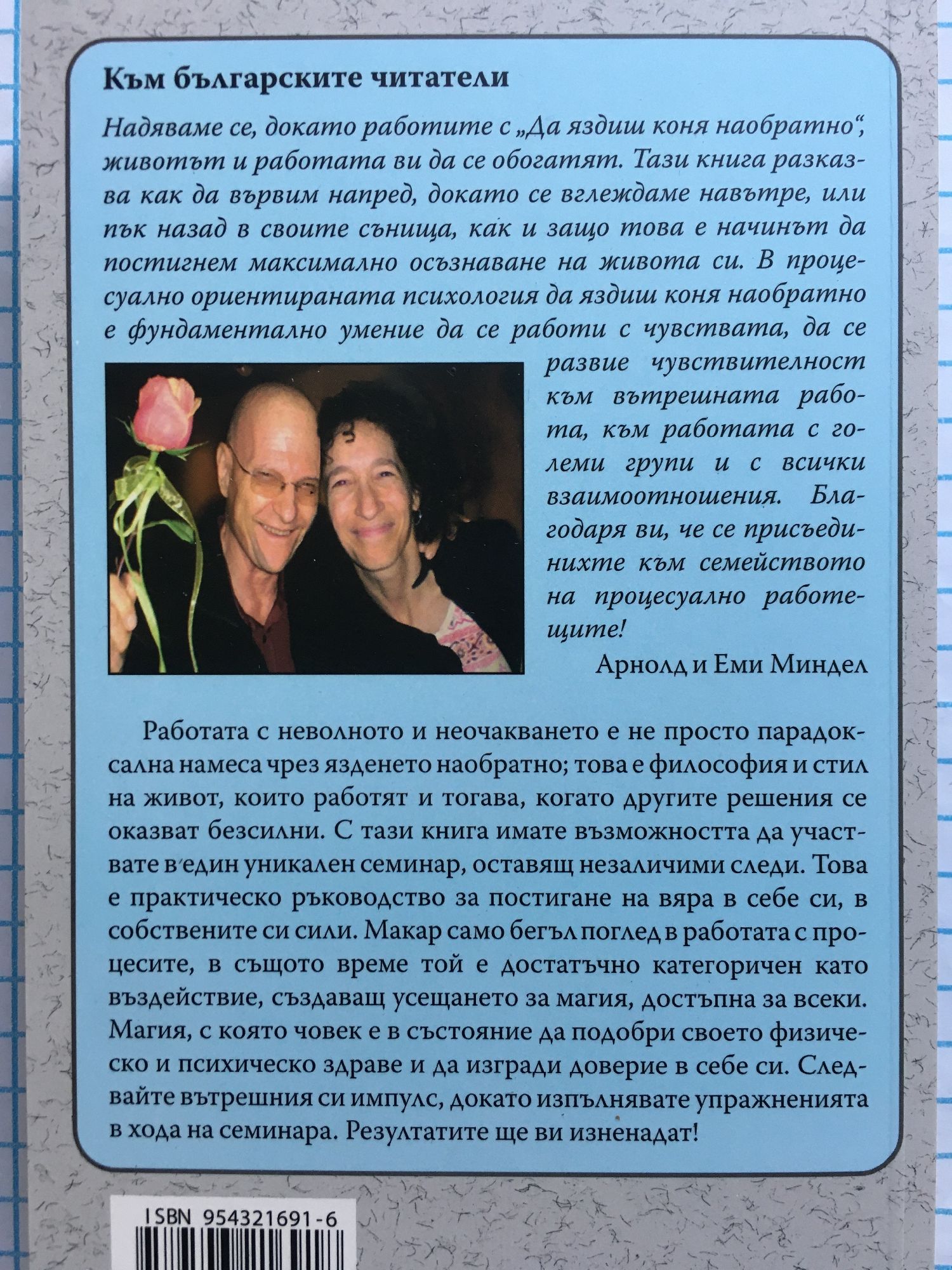 Надяваме се, докато работите с „Да яздиш коня наобратно“, животът и работата ви да се обогатят. Тази книга разказва как да вървим напред, докато се вглеждаме навътре, или пък назад в своите сънища, как и защо това е начинът да постигнем максимално осъзнаване на живота си. В процесуално ориентираната психология да яздиш коня наобратно е фундаментално умение да се работи с чувствата, да се развие чувствителност към вътрешната работа, към работата с големи групи и с всички взаимоотношения. Благодаря ви, че се присъединихте към семейството на процесуално работещите!" - Арнолд и Еми Миндел Работата с неволното и неочакването е не просто парадоксална намеса чрез язденето наобратно; това е философия и стил на живот, които работят и тогава, когато другите решения се оказват безсилни. С тази книга имате възможността да участвате в един уникален семинар, оставящ незаличими следи. Това е практическо ръководство за постигане на вяра в себе си, в собствените си сили. Макар само бегъл поглед в работата с процесите, в същото време той е достатъчно категоричен като въздействие, създаващ усещането за магия, достъпна за всеки. Магия, с която човек е в състояние да подобри своето физическо и психическо здраве и да изгради доверие в себе си. Следвайте вътрешния си импулс, докато изпълнявате упражненията в хода на семинара. Резултатите ще ви изненадат!