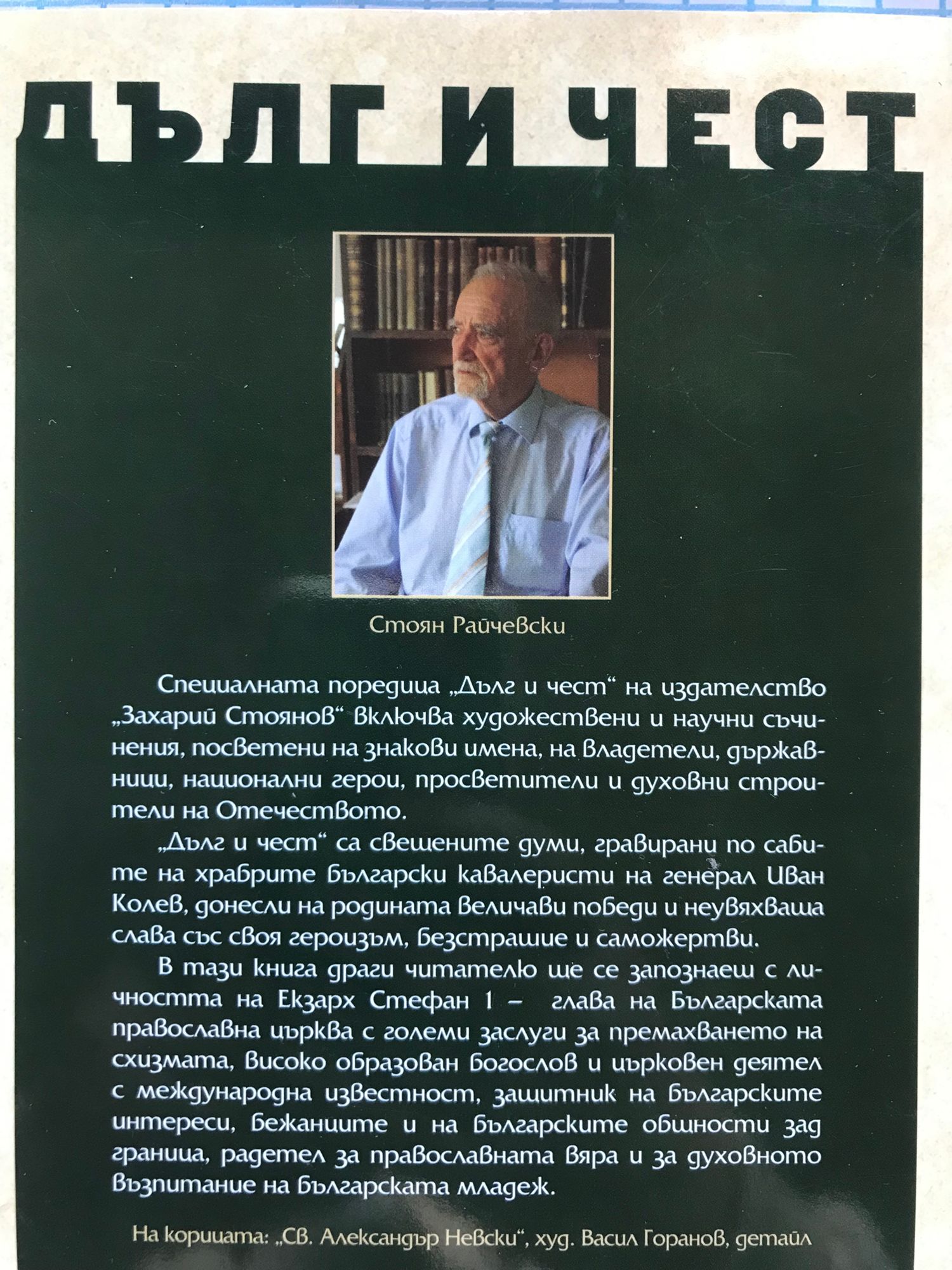 Специалната поредица „Дълг и чест“ на издателство „Захарий Стоянов“ включва художествени и научни съчинения, посветени на знакови имена, на владетели, държавници, национални герои, просветители и духовни строители на Отечеството. „Дълг и чест“ са свещените думи, гравирани по сабите на храбрите български кавалеристи на генерал Иван Колев, донесли на родината величави победи и неувяхваща слава със своя героизъм, безстрашие и саможертви. В тази книга драги читателю ще се запознаеш с личността на Екзарх Стефан I - глава на Българската православна църква с големи заслуги за премахването на схизмата, високо образован богослов и църковен деятел с международна известност, защитник на българските интереси, бежанците и на българските общности зад граница, радетел за православната вяра и за духовното възпитание на българската младеж.