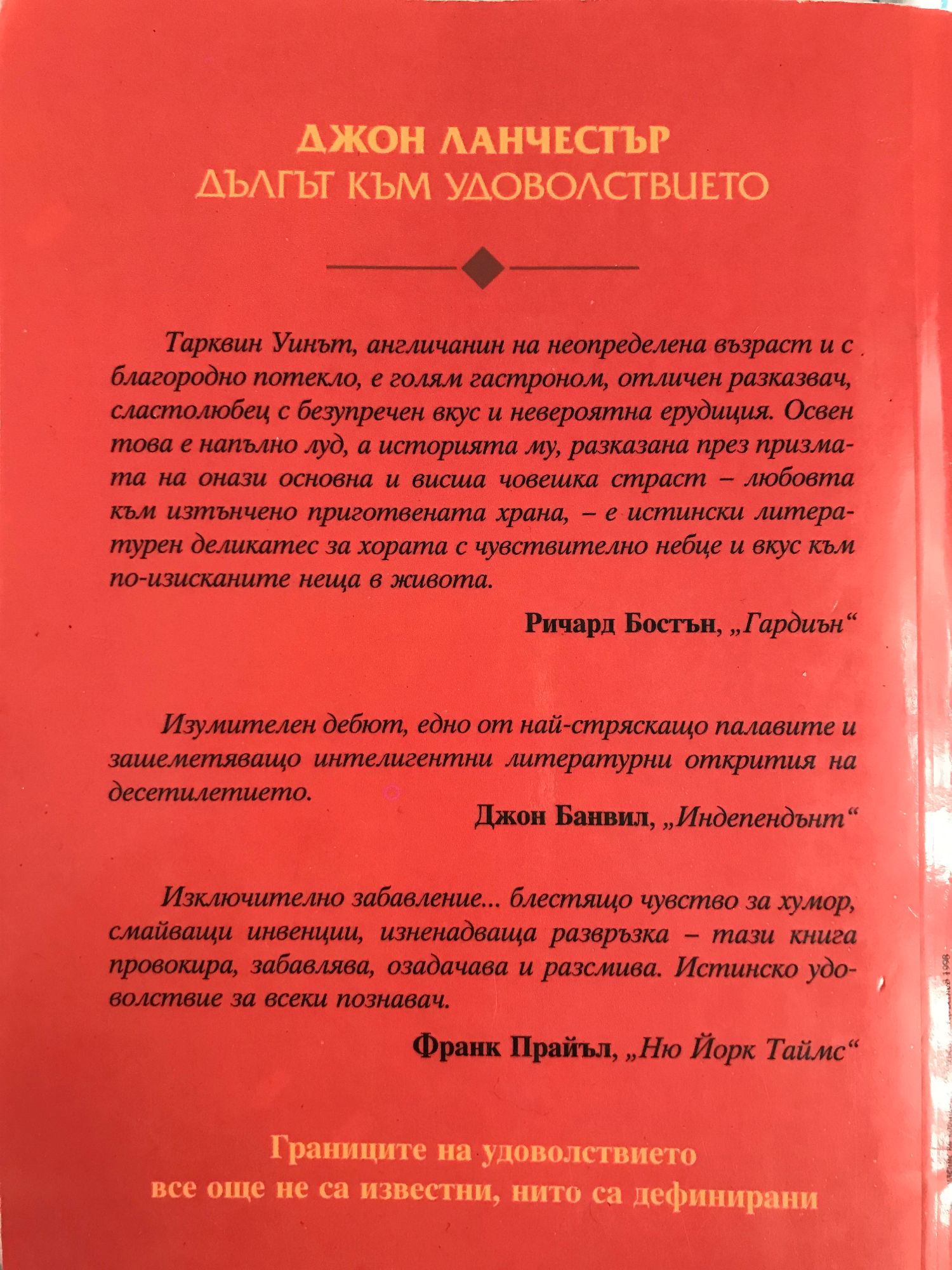 Тарквин Уинът, англичанин с благородно потекло, е голям гастроном, отличен разказвач и комичен сноб с невероятна ерудиция. Освен това е напълно луд, а историята му, разказана през призмата на любовта към изтънчено приготвената храна, е истински литературен деликатес за хората с чувствително небце и вкус към по-изтънчените удоволствия в живота. "Изключително забавление... блестящо чувство за хумор, смайващи инвенции, изненадващa развръзка - тази книга провокира, озадачава и разсмива." Ню Йорк Таймс "Екзотична готварска книга, брилянтен трилър и духовит философски трактат." Бостън Глоуб "Един от най-ексцентричните и зашеметяващо интелигентни романи." Индипендънт
