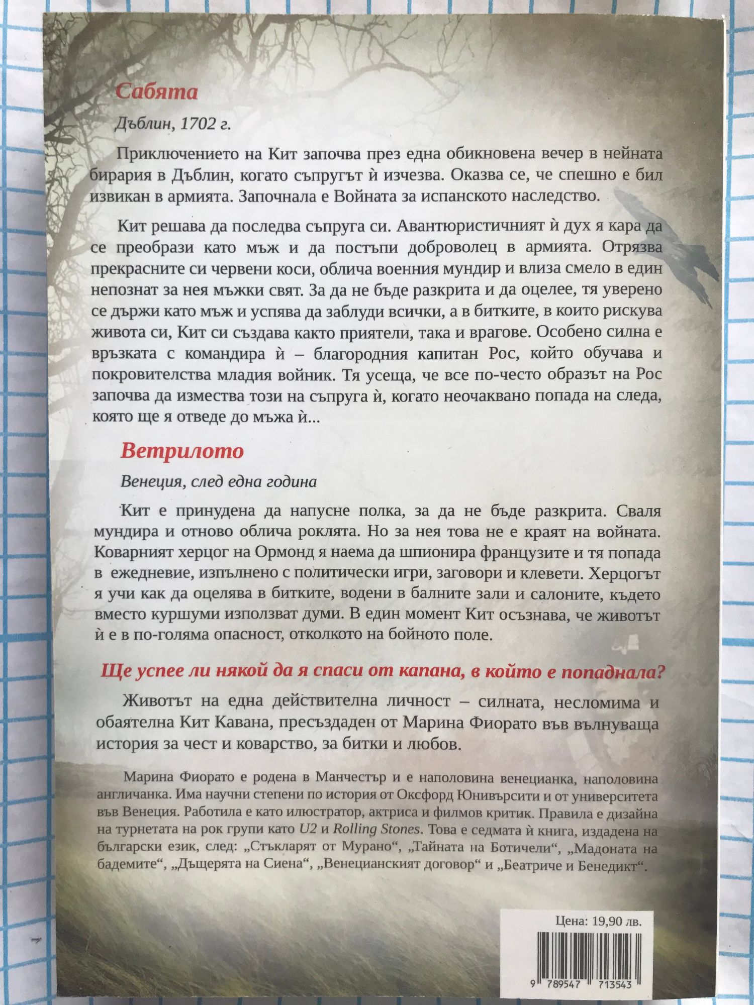 Сабята Дъблин, 1702 г. Приключението на Кит започва през една обикновена вечер в нейната бирария в Дъблин, когато съпругът ? изчезва. Оказва се, че спешно е бил извикан в армията. Започнала е Войната за испанското наследство. Кит решава да последва съпруга си. Авантюристичният ? дух я кара да се преобрази като мъж и да постъпи доброволец в армията. Тя отрязва прекрасните си червени коси, облича военния мундир и влиза смело в един непознат за нея мъжки свят. За да не бъде разкрита и да оцелее, тя уверено се държи като мъж и успява да заблуди всички, а в битките, в които рискува живота си, Кит си създава както приятели, така и врагове. Особено силна е връзката с командира ? – благородния капитан Рос, който обучава и покровителства младия войник. Тя усеща, че все по-често образът на Рос започва да измества този на съпруга ?, когато неочаквано попада на следа, която ще я отведе до мъжа ?... Ветрилото Венеция, след една година Кит е принудена да напусне полка, за да не бъде разкрита. Тя сваля мундира и отново облича роклята. Но за нея това не е краят на войната. Коварният херцог на Ормонд я наема да шпионира французите и тя попада в ежедневие, изпълнено с политически игри, заговори и клевети. Херцогът я учи как да оцелява в битките, водени в балните зали и салоните, където вместо куршуми използват думи. В един момент Кит осъзнава, че животът ? е в по-голяма опасност, отколкото на бойното поле. Ще успее ли някой да я спаси от капана, в който е попаднала? Животът на една действителна личност – силната, несломима и обаятелна Кит Кавана, пресъздаден от Марина Фиорато във вълнуваща история за чест и коварство, за битки и любов.