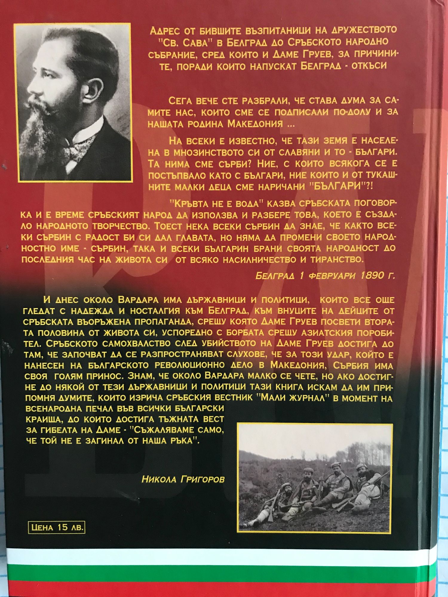 Адрес от бившите възпитаници на дружеството "Св.Сава" в Белград до Сръбското народно събрание, сред които и Даме Груев, за причините, поради които напускат Белград - откъси. Сега вече сте разбрали, че става дуа за самите нас, които сме се подписали по-долу и зе нашата родина Македония … На всеки е известно, че тази земя е населена в мнозинството си от славяни и то - българи.Та нима сме сърби? Ние, с които всякога се е постъпвало като с българи, ние които и от тукашните малки деца сме наричани "БЪЛГАРИ"?! "Кръвта на е вода" казва сръбската поговорка и е време сръбският народ да използва и разбере това, което е създало народното творчество. Тоест нека всеки сърбин да знае, че както всеки сърбин с радост би си дал главата, но няма да промени своето народносттно име - сърбин, така и всеки българин брани своята народност до последния час на живота си от всяко насилничество и тиранство. Адрес от бившите възпитаници на дружеството "Св.Сава" в Белград до Сръбското народно събрание, сред които и Даме Груев, за причините, поради които напускат Белград - откъси. Сега вече сте разбрали, че става дуа за самите нас, които сме се подписали по-долу и зе нашата родина Македония … На всеки е известно, че тази земя е населена в мнозинството си от славяни и то - българи.Та нима сме сърби? Ние, с които всякога се е постъпвало като с българи, ние които и от тукашните малки деца сме наричани "БЪЛГАРИ"?! "Кръвта на е вода" казва сръбската поговорка и е време сръбският народ да използва и разбере това, което е създало народното творчество. Тоест нека всеки сърбин да знае, че както всеки сърбин с радост би си дал главата, но няма да промени своето народносттно име - сърбин, така и всеки българин брани своята народност до последния час на живота си от всяко насилничество и тиранство.