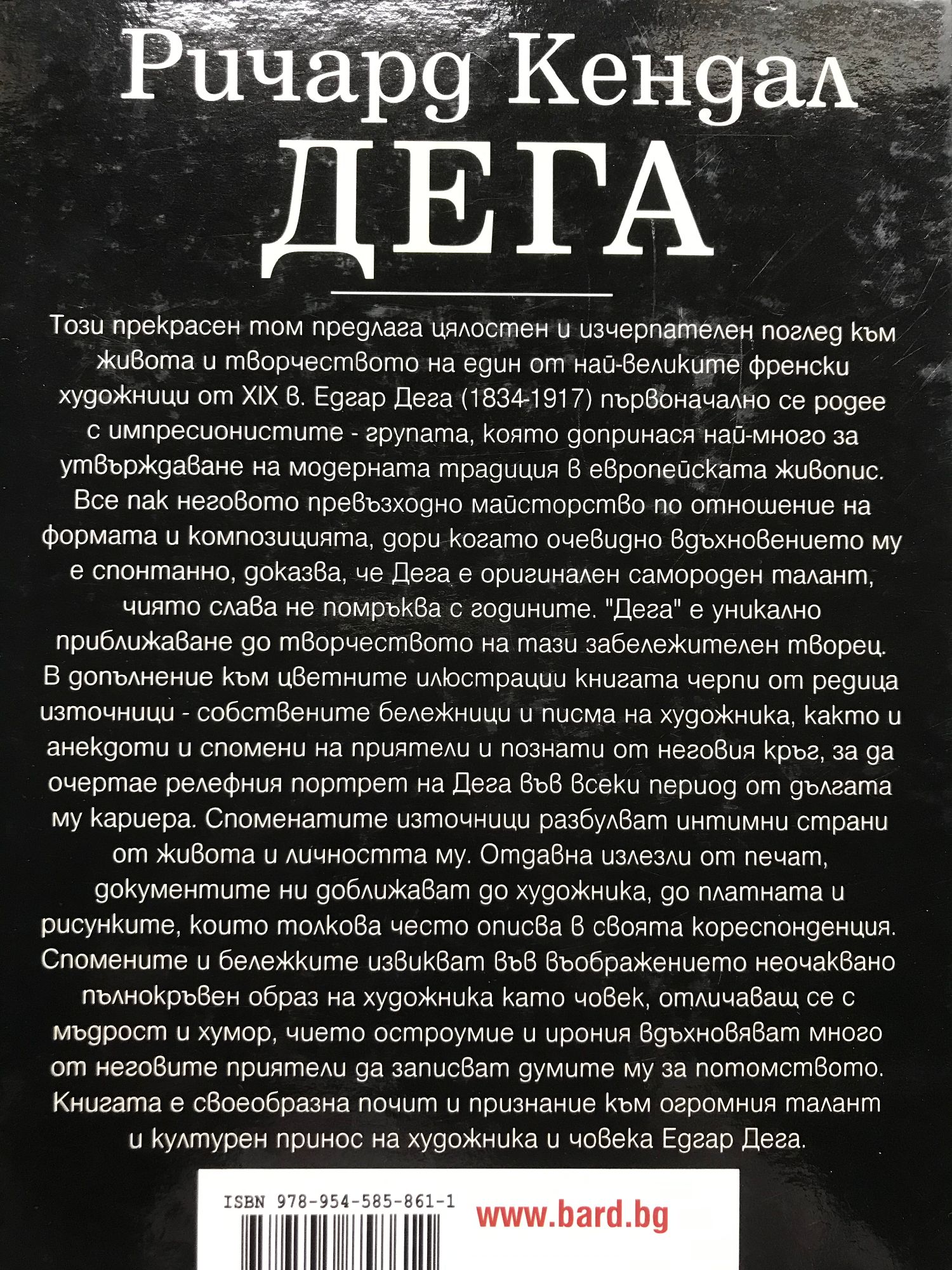 Книгата предлага цялостен и изчерпателен поглед към живота и творчеството на един от най-великите френски художници от XIX век. Едгар Дега (1834-1917) първоначално се родее с импресионистите - групата, която допринася най-много за утвърждаване на модерната традиция в европейската живопис. Все пак неговото превъзходно майсторство по отношение на формата и композицията, дори когато очевидно вдъхновението му е спонтанно, доказва, че Дега е оригинален самороден талант, чиято слава не помръква с годините. "Дега" е уникално приближаване до творчеството на този забележителен творец. В допълнение към цветните илюстрации книгата черпи от редица източници - собствените бележници и писма на художника, както и анакдоти и спомени на приятели и познати от неговия кръг, за да очертае релефния портрет на Дега във всеки период от дългата му кариера. Споменатите източници разбулват интимни страни от живота и личността му. Отдавна излезли от печат, документите ни доближават до художника, до платната и рисунките, които толкова често описва в своята кореспонденция. Спомените и бележките извикват във въображението неочаквано пълнокръвен образ на художника като човек, отличаващ се с мъдрост и хумор, чието остроумие и ирония вдъхновяват много от неговите приятели да записват думите му за потомството. Книгата е своеобразна почит и признание към огромния талант и културен принос на художника и човека Едгар Дега.