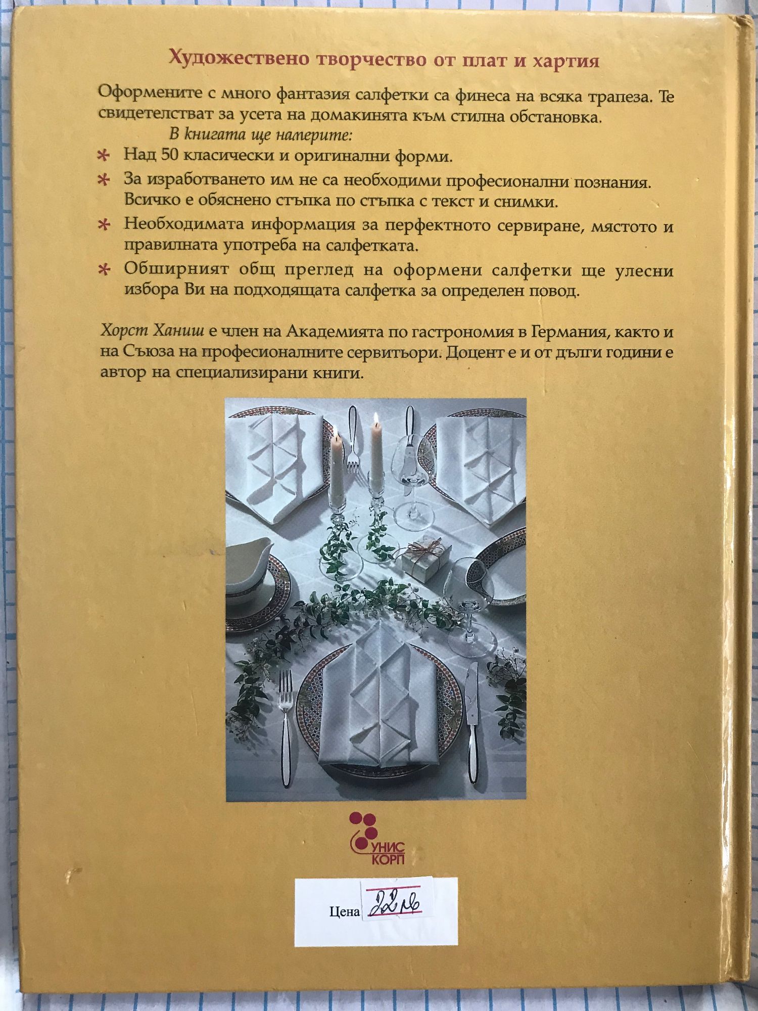 Оформените с много фантазия салфетки са финеса на всяка трапеза. Те свидетелстват за усета на домакинята към стилна обстановка. В книгата ще намерите: Над 50 класически и оригинални форми; За изработването им не са необходими професионални познания. Всичко е обяснено стъпка по стъпка с текст и снимки; Необходимата информация за перфектното сервиране, мястото и правилната употреба на салфетката; Обширният общ преглед на оформени салфетки ще улесни избора Ви на подходящата салфетка за определен повод. Хорст Ханиш е член на Академията по гастрономия в Германия, както и на Съюза на професионалните сервитьори. Доцент е и от дълги години е автор на специализирани книги.