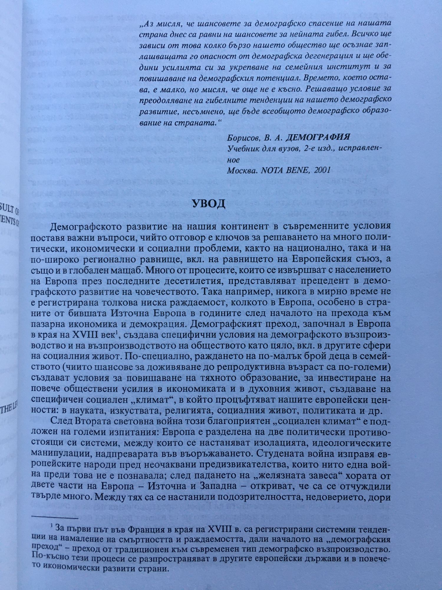 В книгата се представя панорама на демографското развитие на европейските държави след Втората световна война, като повечето от данните са след 1960 г. до наши дни. Целта е да се открои спецификата на Източна Европа. Подробно са изследвани тенденциите на раждаемостта, смъртността и демографското остаряване. Всеки от тези демографски процеси е представен посредством серия от индикатори и специфични демографски методи за изследване на демографската динамика. Представени са оригинални типологизации на европейските държави по основни демографски показатели, както и по комбинации от показатели. От анализа произтича извод, че съществуват значими разлики между Източна и Западна Европа – и при трите изследвани демографски процеси (раждаемост, смъртност, демографско остаряване) и техните компоненти. Статистико-демографският анализ е придружен от социологически коментар относно факторите обусловили наблюдаваната специфика в регионите на Европа. Направен е опит за определяне мястото на България в съвременните демографски процеси на континента.
