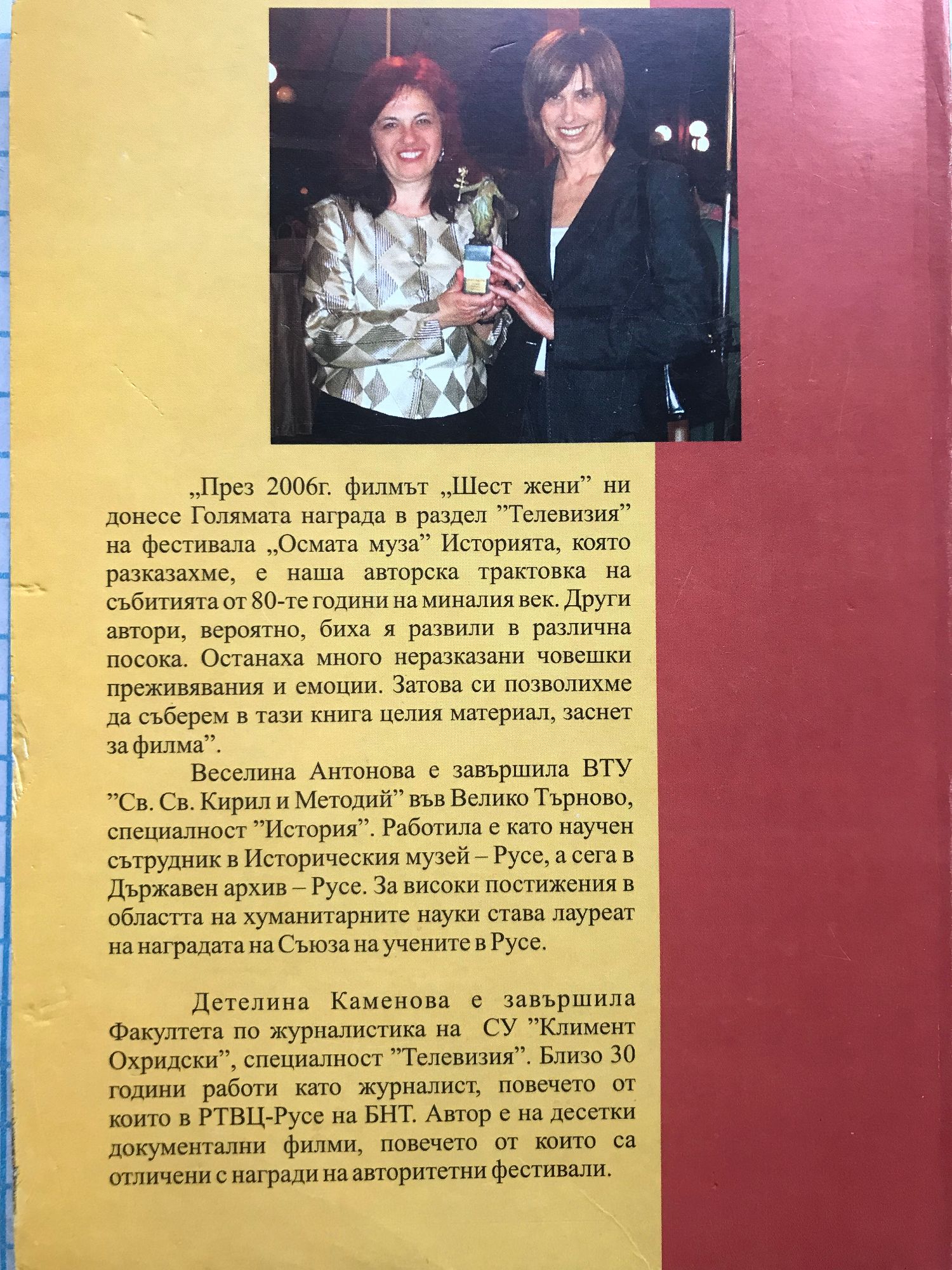 „През 2006г. филмът “Шест жени” ни донесе Голямата награда в раздел "Телевизия” на фестивала „Осмата муза”. Историята, която разказахме, е наша авторска трактовка на събитията от 80-те години па миналия век. Други автори, вероятно, биха я развили в различна посока. Останаха много преразказани човешки преживявания и емоции. Затова си позволихме да съберем в тази книга целия материал, заснет за филма". Веселина Антонова е завършила ВТУ "Св. Св. Кирил и Методий" във Велико Търново, специалност "История". Работила е като научен Държавен архив Русе. За високи постижения в областта на хуманитарните науки става лауреат на награда га на Съюза на учените в Русе. Детелина Каменова е завършила Факултета по журналистика на СУ "Климент Охридски", специалност "Телевизия". Близо 30 години работи като журналист, повечето от които в РТВЦ-Русе на БНТ. Автор е на десетки документални филми, повечето от които са отличени с награди па автори тегни фестивали.