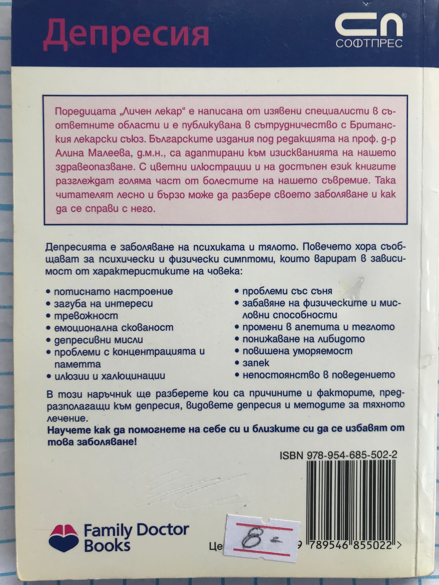 Поредицата „Личен лекар” е написана от изявени специалисти в съответните области и е публикувана в сътрудничество с Британския лекарски съюз. Българските издания под редакцията на проф. д-р Алина Малеева, д.м.н., са адаптирани към изискванията на нашето здравеопазване. С цветни илюстрации и на достъпен език книгите разглеждат голяма част от болестите на нашето съвремие. Така читателят лесно и бързо може да разбере своето заболяване и как да се справи с него. Депресията е заболяване на психиката и тялото. Повечето хора съобщават за психически и физически симптоми, които варират в зависимост от характеристиките на човека: • потиснато настроение • загуба на интереси • тревожност • емоционална скованост • депресивни мисли • проблеми с концентрацията и паметта • илюзии и халюцинации • проблеми със съня • забавяне на физическите и мисловни способности • промени в апетита и теглото • понижаване на либидото • повишена уморяемост • запек • непостоянство в поведението В този наръчник ще разберете кои са причините и факторите, предразполагащи към депресия, видовете депресия и методите за тяхното лечение. Научете как да помогнете на себе си и близките си да се избавят от това заболяване!