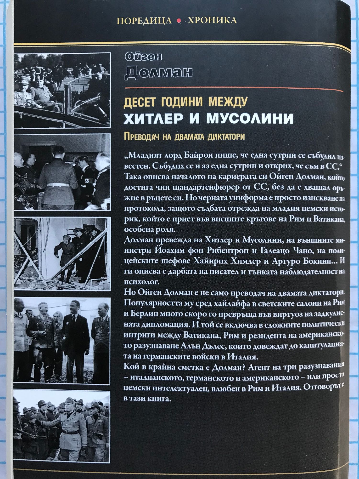 "Младият лорд Байрон пише, че една сутрин се събудил известен. Събудих се и аз една сутрин и открих, че съм в СС." Така описва началото на кариерата си Ойген Долман, който достига чин щандартенфюрер от СС, без да е хващал оръжие в ръцете си. Но черната униформа е просто изискване на протокола, защото съдбата отрежда на младия немски историк, който е приет във висшите кръгове на Рим и Ватикана, особена роля. Долман превежда на Хитлер и Мусолини, на външните министри Йоахим фон Рибентроп и Галеацо Чано, на полицейските шефове Хайнрих Химлер и Артуро Бокини... И ги описва с дарбата на писател и тънката наблюдателност на психолог. Но Ойген Долман е не само преводач на двамата диктатори. Популярността му сред хайлайфа в светските салони на Рим и Берлин много скоро го превръща във виртуоз на задкулисната дипломация. И той се включва в сложните политически интриги между Ватикана, Рим и резидента на американското разузнаване Алън Дълес, които довеждат до капитулацията на германските войски в Италия. Кой в крайна сметка е Долман? Агент на три разузнавания - италианското, германското и американското - или просто немски интелектуалец, влюбен в Рим и Италия. Отговорът е в тази книга.
