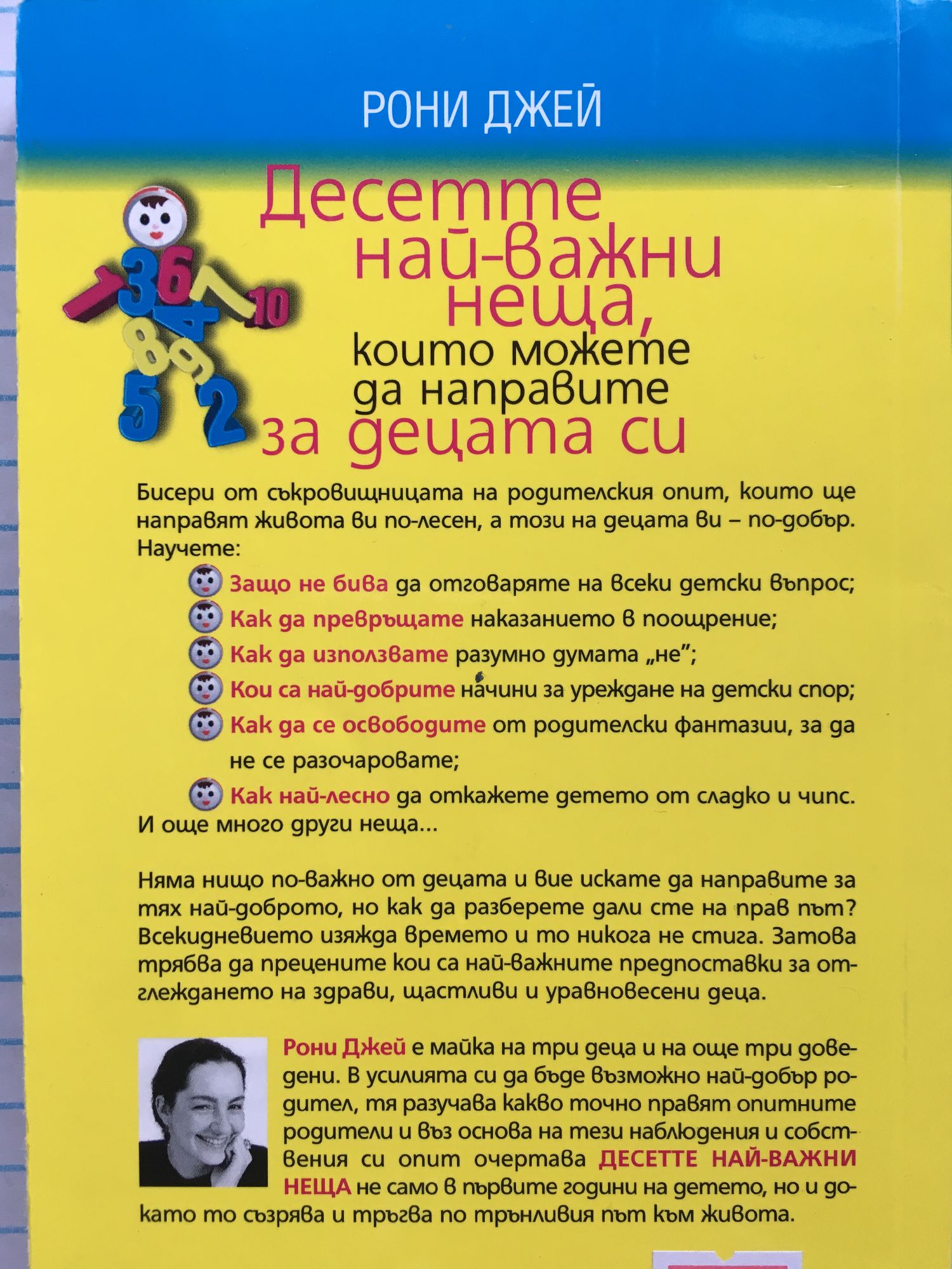 Бисери от съкровищницата на родителския опит, които ще направят живота ви по-лесен, а този на децата ви – по-добър. Няма нищо по-важно от децата и вие искате да направите за тях най-доброто, но как да разберете дали сте на прав път? Всекидневието изяжда времето и то никога не стига. Затова трябва да прецените кои са най-важните предпоставки за отглеждането на здрави, щастливи и уравновесени деца. Научете: - Защо не бива да отговаряте на всеки детски въпрос; - Как да превръщате наказанието в поощрение; - Как да използвате разумно думата „не”; - Кои са най-добрите начини за уреждане на детски спор; - Как да се освободите от родителски фантазии, за да не се разочаровате; - Как най-лесно да откажете детето от сладко и чипс. И още много други неща... Рони Джей е майка на три деца и на още три доведени. В усилията си да бъде възможно най-добър родител, тя разучава какво точно правят опитните родители и въз основа на тези наблюдения и собствения си опит очертава ДЕСЕТТЕ НАЙ-ВАЖНИ НЕЩА не само в първите години на детето, но и докато то съзрява и тръгва по трънливия път към живота.