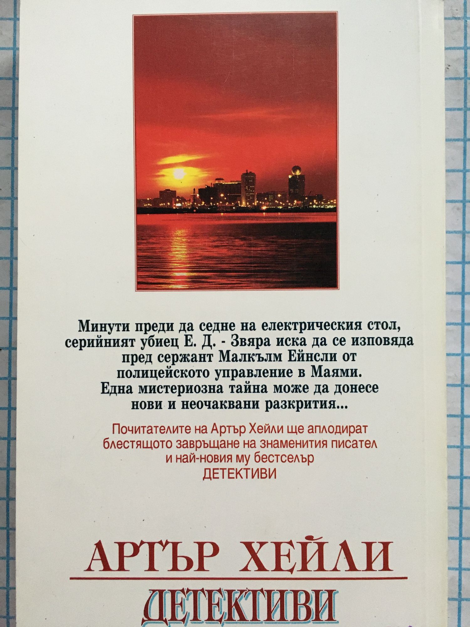 Минути преди да седне на електрическия стол, серийният убиец Е. Д. — Звяра иска да се изповяда пред сержант Малкълм Ейнсли от полицейското управление в Маями. Една мистериозна тайна може да донесе нови и неочаквани разкрития… Почитателите на Артър Хейли ще аплодират блестящото завръщане на знаменития писател и най-новия му бестселър ДЕТЕКТИВИ.