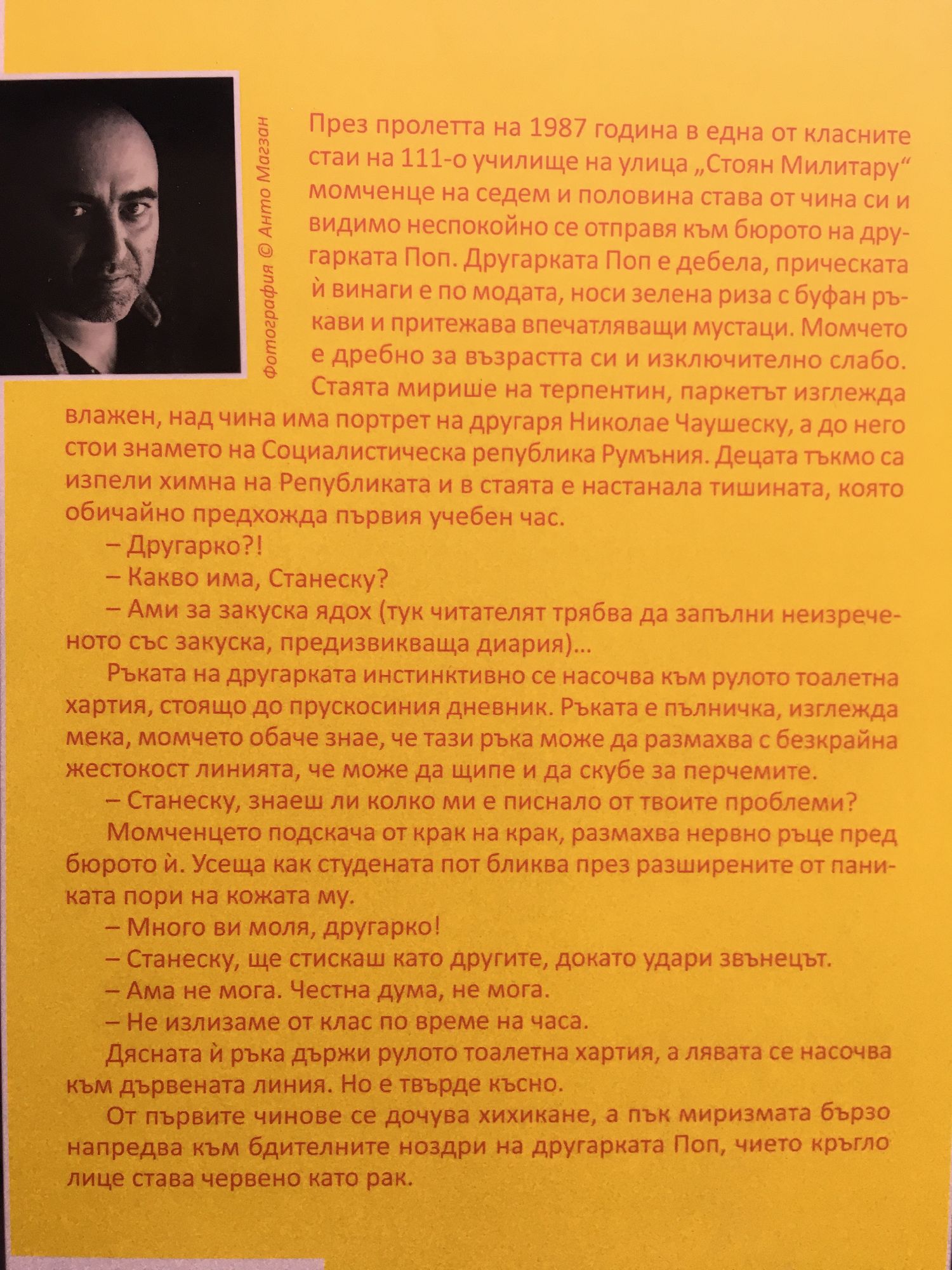 Богдан-Александру Станеску ни повежда из бруталния свят на израстването в букурещките крайни квартали с образи, случки и типажи, близки и на нас, като съседи и съвременници. Това е книга за поколението на прехода, невписващо се, чуждо и неразбираемо дори за най-близките си хора, които от цялото си сърце ни желаят доброто, но не не разполагат с познанието как да го осигурят и са напълно безсилни; книга за това как в детството сме малки и лоши хора, изплашени от собствените си недостатъци и страхове и борещи се да избягат от лапите на една дълбоко формираща ни възраст, която може да изглежда като всепоглъщаща лична бездна. Това не е непременно роман за израстването, нито за припомнянето на миналото, а е по-скоро литературен опит за преживяване на „грешките“ от детството и юношеството в полето на разказа. Той може да се чете като пъзел от дванадесет отделни истории, подредени в хронологичен ред, от детството до зрелостта, истории, подлютяващи именно в онези рани, които в собствените ни очи ни правят по-малко хуманни и достойни от останалите хора, защото нашата травма – липса, копнеж или разочарование – е най-голямата. Тя е наша. Ние сме го преживели и именно ние разбираме болката и непоносимостта ? дори отвъд думите.