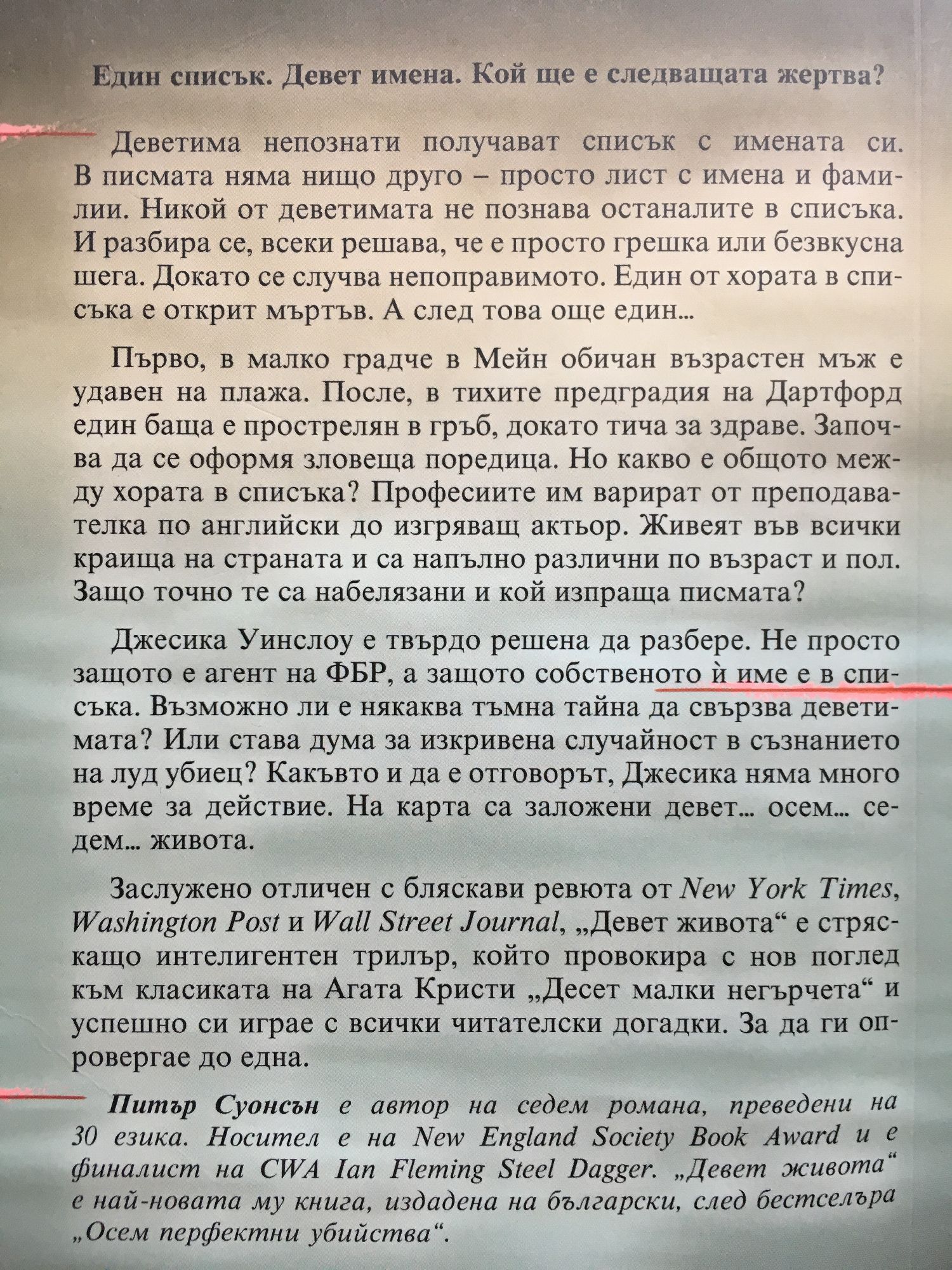 Ако името ти е в списъка, някой иска смъртта ти. Един списък. Девет имена. Кой ще е следващата жертва? Деветима непознати получават списък с имената си. В писмата няма нищо друго - просто лист с имена и фамилии. Никой от деветимата не познава останалите в списъка. И разбира се, всеки решава, че е просто грешка или безвкусна шега. Докато се случва непоправимото. Един от хората в списъка е открит мъртъв. А след това още един... Първо, в малко градче в Мейн обичан възрастен мъж е удавен на плажа. После, в тихите предградия на Дартфорд един баща е прострелян в гръб, докато тича за здраве. Започва да се оформя зловеща поредица. Но какво е общото между хората в списъка? Професиите им варират от преподавателка по английски до изгряващ актьор. Живеят във всички краища на страната и са напълно различни по възраст и пол. Защо точно те са набелязани и кой изпраща писмата? Джесика Уинслоу е твърдо решена да разбере. Не просто защото е агент на ФБР, а защото собственото ѝ име е в списъка. Възможно ли е някаква тъмна тайна да свързва деветимата? Или става дума за изкривена случайност в съзнанието на луд убиец? Какъвто и да е отговорът, Джесика няма много време за действие. На карта са заложени девет... осем... седем... живота. Заслужено отличен с бляскави ревюта от New York Times, Washington Post и Wall Street Journal, Девет живота е стряскащо интелигентен трилър, който провокира с нов поглед към класиката на Агата Кристи Десет малки негърчета и успешно си играе с всички читателски догадки. За да ги опровергае до една.