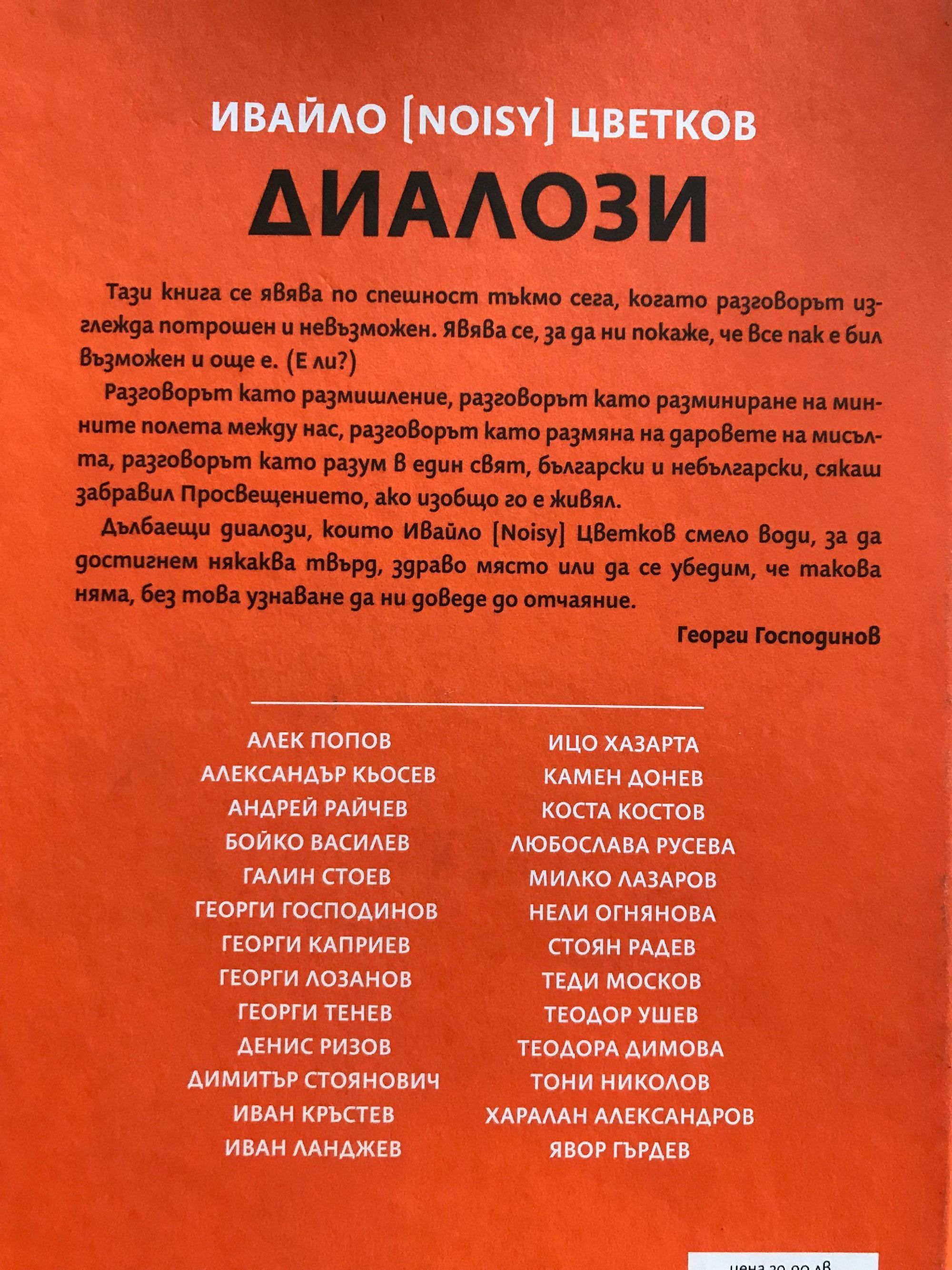 Тази книга се явява по спешност тъкмо сега, когато разговорът изглежда потрошен и невъзможен. Явява се, за да ни покаже, че все пак е бил възможен и още е. (Е ли?) Разговорът като размишление, разговорът като разминиране на минните полета между нас, разговорът като размяна на даровете на мисълта, разговорът като разум в един свят, български и небългарски, сякаш забравил Просвещението, ако изобщо го е живял. Дълбаещи диалози, които Ивайло (Noisy) Цветков смело води, за да достигнем някаква твърд, здраво място или да се убедим, че такова няма, без това узнаване да ни доведе до отчаяние. Георги Господинов