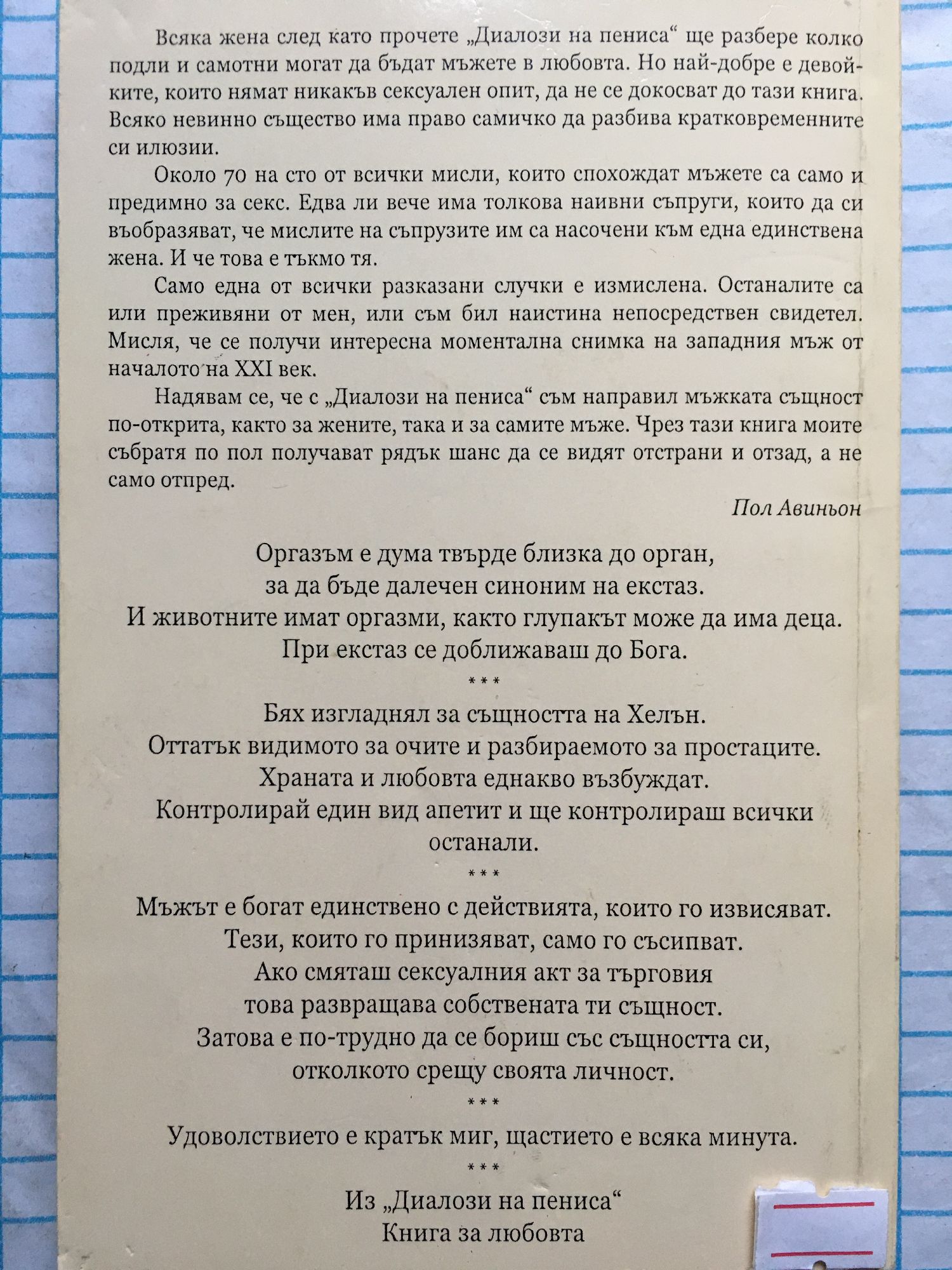 Всяко невинно същество има право самичко да разбива кратковременните си илюзии. Всяка жена след като прочете „Диалози на пениса" ще разбере колко подли и самотни могат да бъдат мъжете в любовта. Но най-добре е девойките, които нямат никакъв сексуален опит, да не се докосват до тази книга. Около 70 на сто от всички мисли, които спохождат мъжете са само и предимно за секс. Едва ли вече има толкова наивни съпруги, които да си въобразяват, че мислите на съпрузите им са насочени към една единствена жена. И че това е тъкмо тя. Само една от всички разказани случки е измислена. Останалите са или преживяни от мен, или съм бил наистина непосредствен свидетел. Мисля, че се получи интересна моментална снимка на западния мъж от началото на XXI век. Надявам се, че с „Диалози на пениса" съм направил мъжката същност по-открита, както за жените, така и за самите мъже. Чрез тази книга моите събратя по пол получават рядък шанс да се видят отстрани и отзад, а не само отпред. Пол Авиньон Оргазъм е дума твърде близка до орган, за да бъде далечен синоним на екстаз. И животните имат оргазми, както глупакът може да има деца. При екстаз се доближаваш до Бога. Бях изгладнял за същността на Хелън. Оттатък видимото за очите и разбираемото за простаците. Храната и любовта еднакво възбуждат. Контролирай един вид апетит и ще контролираш всички останали. Мъжът е богат единствено с действията, които го извисяват. Тези, които го принизяват, само го съсипват. Ако смяташ сексуалния акт за търговия това развращава собствената ти същност. Затова е по-трудно да се бориш със същността си, отколкото срещу своята личност. Удоволствието е кратък миг, щастието е всяка минута. Из „Диалози на пениса" Книга за любовта