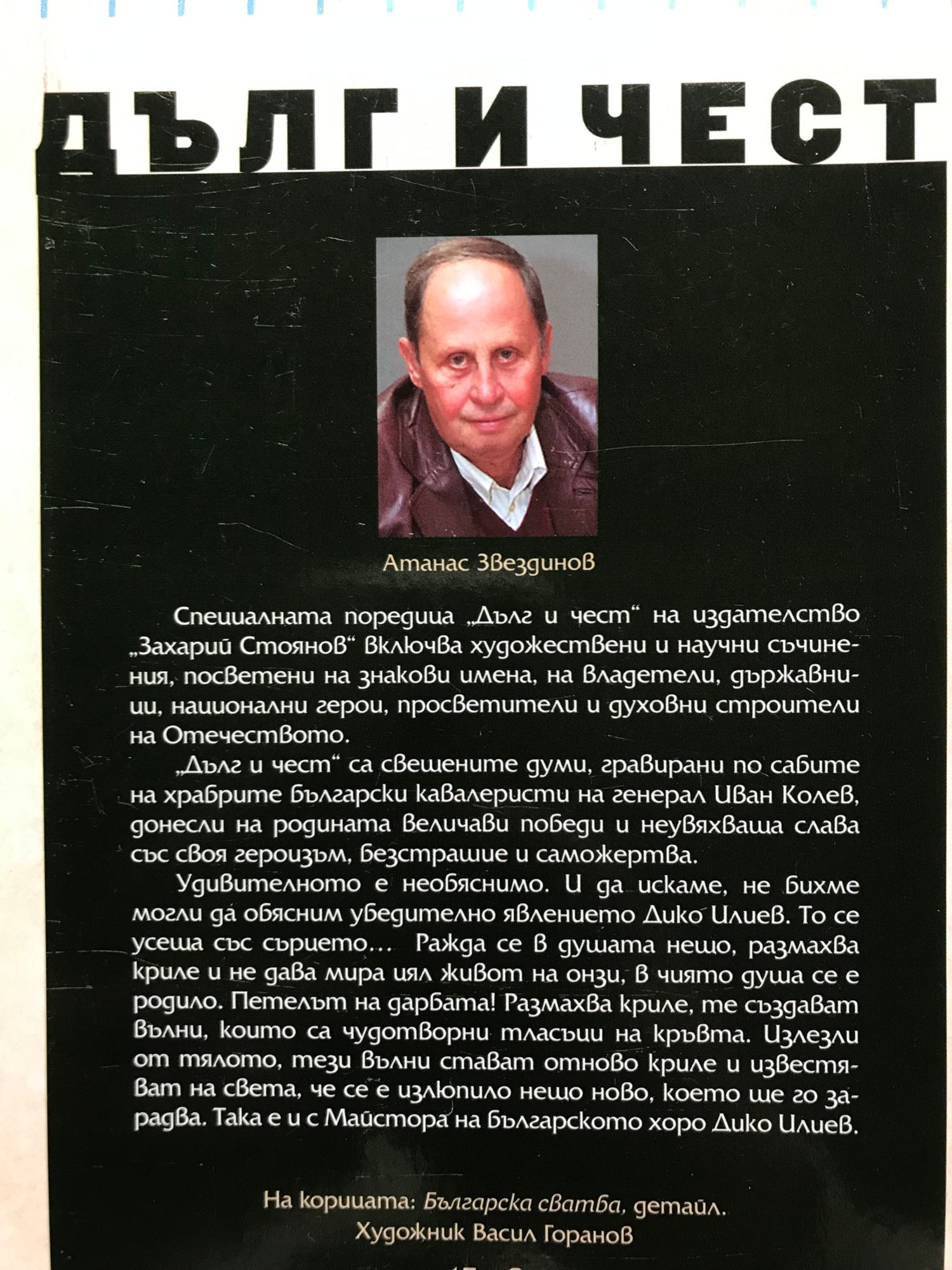 Специалната поредица Дълг и чест на издателство Захарий Стоянов включва художествени и научни съчинения, посветени на знакови имена, на владетели, държавници, национални герои, просветители и духовни строители на Отечеството. Удивителното е необяснимо. И да искаме, не бихме могли да обясним убедително явлението Дико Илиев. То се усеща със сърцето... Ражда се в душата нещо, размахва криле, те създават вълни, които са чудотворни тласъци на кръвта. Излезли от тялото, тези вълни стават отново криле и известяват на света, че се е излюпило нещо ново, което ще го зарадва. Така е и с майстора на българското хоро Дико Илиев.