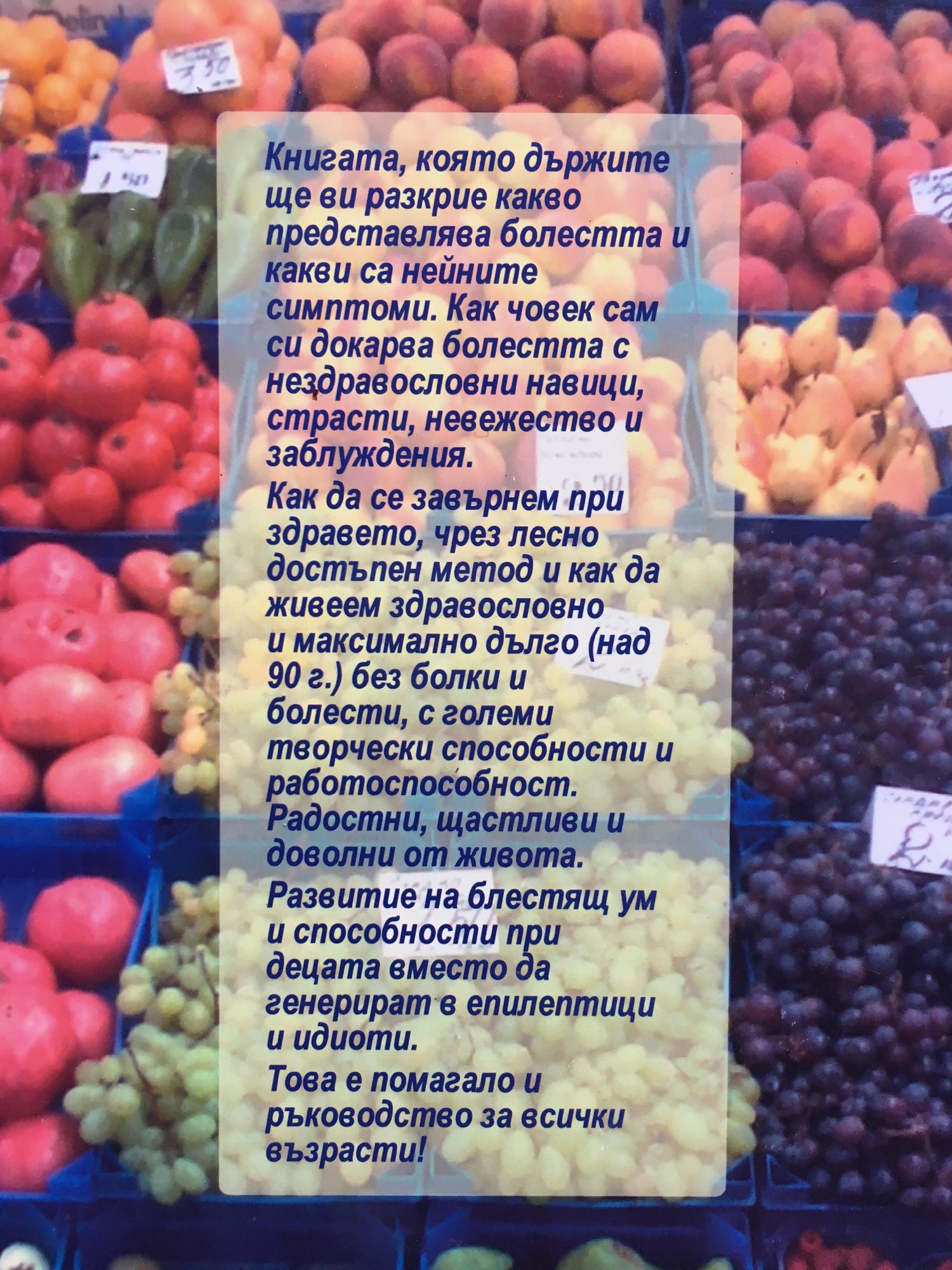 Книгата, която държите ще ви разкрие какво представлява болестта и какви са нейните симптоми. Как човек сам си докарва болестта с нездравословни навици, страсти, невежество и заблуждения. Как да се завърнем при здравето, чрез лесно достъпен метод и как да живеем здравословно и максимално дълго (над 90 г.) без болки и болести, с големи творчески способности и работоспособност. Радостни, щастливи и доволни от живота. Развитие на блестящ ум и способности при децата вместо да генерират в епилептици и идиоти. Това е помагало и ръководство за всички възрасти!
