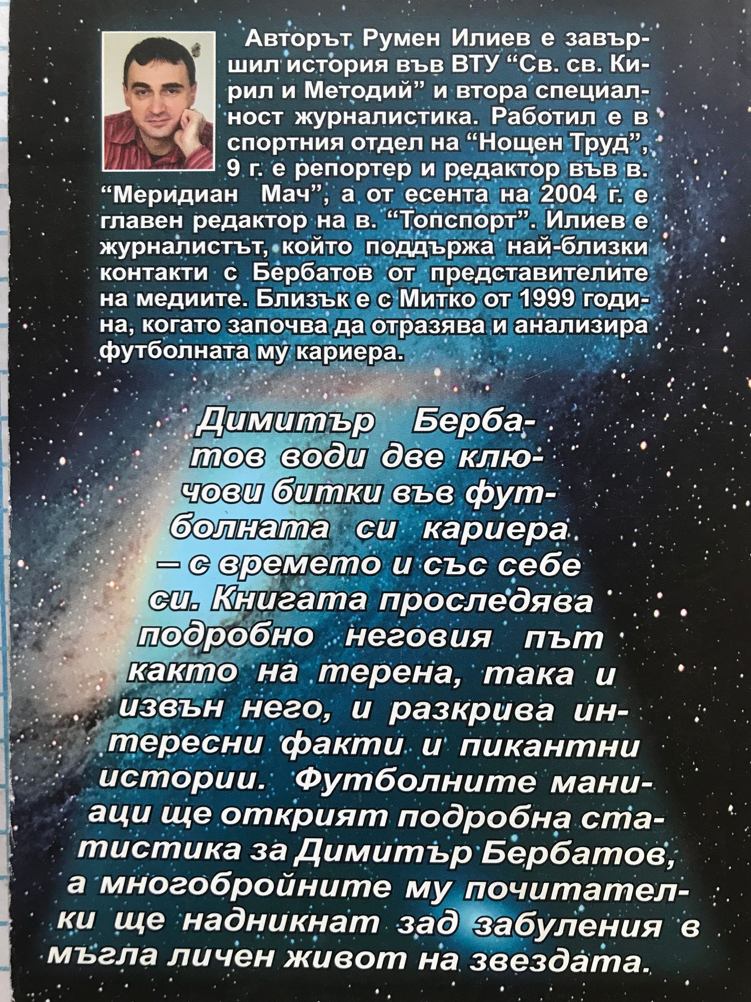 Димитър Бербатов води две ключови битки във футболната си кариера - с времето и със себе си. Книгата проследява подробно неговия път както на терена, така и извън него, и разкрива интересни факти и пикантни истории. Футболните маниаци ще открият подробна статистика за Димитър Бербатов, а многобройните му почитателки ще надникнат зад забуления в мъгла личен живот на звездата. Авторът Румен Илиев е завършил история във ВТУ "Св. св. Кирил и Методий" и втора специалност журналистика. Работил е в спортния отдел на в. "Нощен труд". 9 г. е репортер и редактор във в. "Меридиан Мач", а от есента на 2004 г. е главен редактор на в. "Топспорт". Илиев е журналистът, който поддържа най-близки контакти с Бербатов от представителите на медиите.