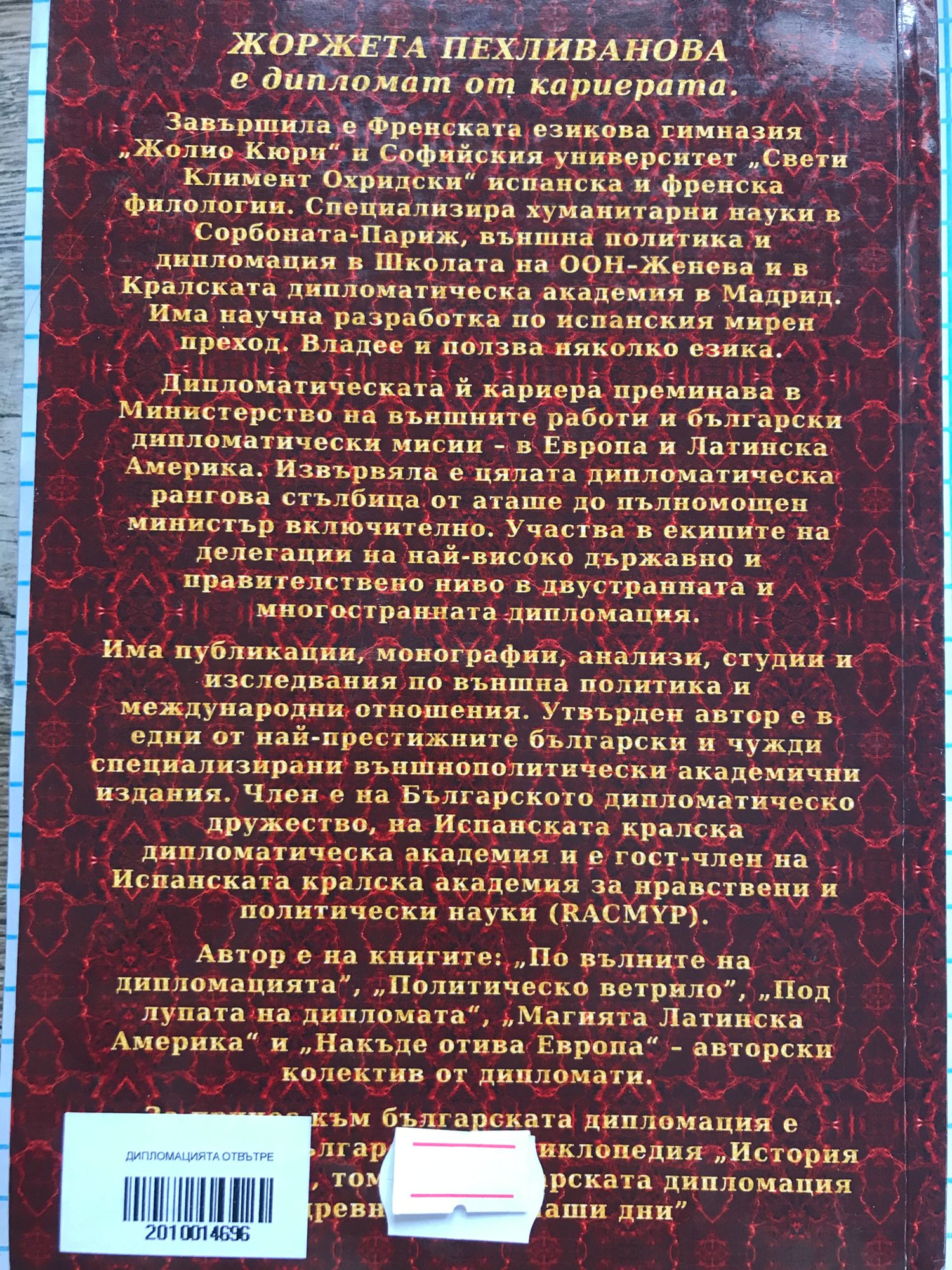 ЖОРЖЕТА ПЕХЛИВАНОВА е дипломат от кариерата. Завършила е Френската езикова гимназия „Жолио Кюри“ и Софийския университет „Свети Климент Охридски“ испанска и френска филологии. Специализира хуманитарни науки в Сорбоната-Париж, външна политика и дипломация в Школата на ООН–Женева и в Кралската дипломатическа академия в Мадрид. Има научна разработка по испанския мирен преход. Владее и ползва няколко езика. Дипломатическата й кариера преминава в Министерство на външните работи и български дипломатически мисии – в Европа и Латинска Америка. Извървяла е цялата дипломатическа рангова стълбица от аташе до пълномощен министър включително. Участва в екипите на делегации на най-високо държавно и правителствено ниво в двустранната и многостранната дипломация. Има публикации, монографии, анализи, студии и изследвания по външна политика и международни отношения. Утвърден автор е в едни от най-престижните български и чужди специализирани външнополитически академични издания. Член е на Българското дипломатическо дружество, на Испанската кралска дипломатическа академия и е гост-член на Испанската кралска академия за нравствени и политически науки (RACMYP). Автор е на книгите: „По вълните на дипломацията”, „Политическо ветрило”, „Под лупата на дипломата“, „Магията Латинска Америка“ и „Накъде отива Европа“ – авторски колектив от дипломати. За принос към българската дипломация е включена в Българската енциклопедия „История на българите”, том ІV „Българската дипломация от древността до наши дни”
