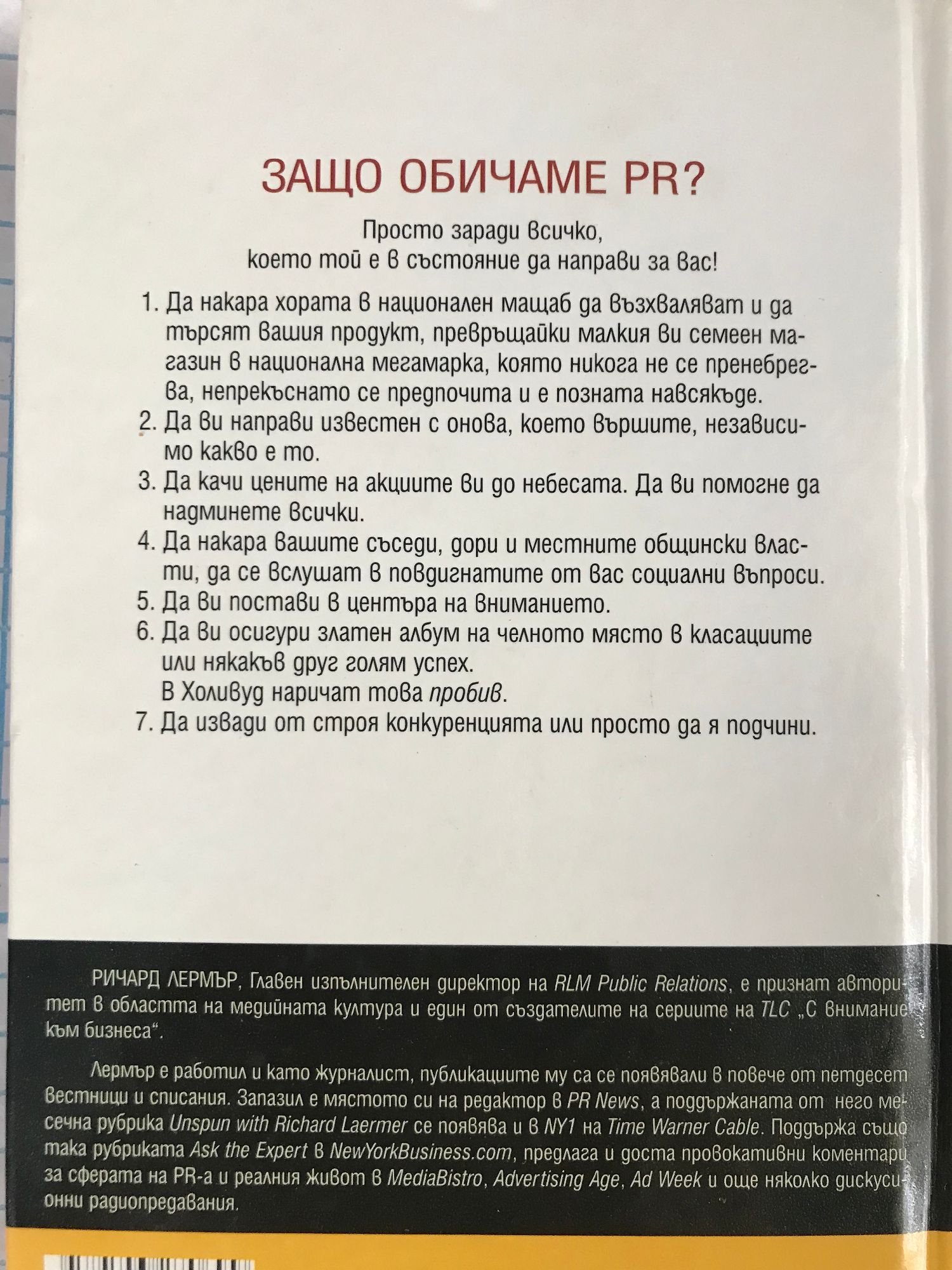 ЗАЩО ОБИЧАМЕ PR? Просто заради всичко, което той е в състояние да направи за вас! 1. Да накара хората в национален мащаб да възхваляват и да търсят вашия продукт, превръщайки малкия ви семеен магазин в национална мегамарка, която никога не се пренебрегва, непрекъснато се предпочита и е позната навсякъде. 2. Да ви направи известен с онова, което вършите, независимо какво е то. 3. Да качи цените на акциите ви до небесата. Да ви помогне да надминете всички. 4. Да накара вашите съседи, дори и местните общински власти, да се вслушат в повдигнатите от вас социални въпроси. 5. Да ви постави в центъра на вниманието. 6. Да ви осигури златен албум на челното място в класациите или някакъв друг голям успех. В Холивуд наричат това пробив. 7. Да извади от строя конкуренцията или просто да я подчини.