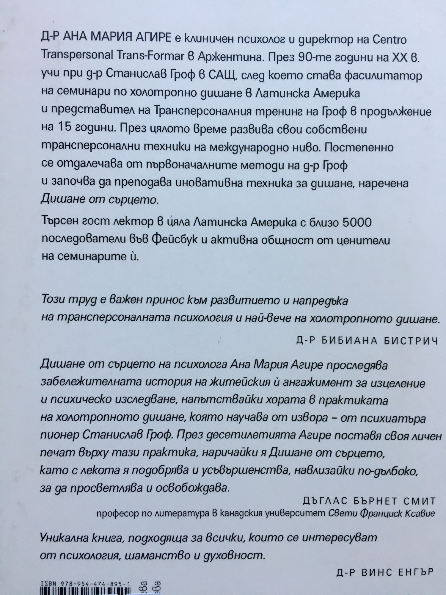Дишане от сърцето на психолога Ана Мария Агире проследява забележителната история на житейския й ангажимент за изцеление и психическо изследване, напътствайки хората в практиката на холотропното дишане, която научава от извора – от психиатъра пионер Станислав Гроф. През десетилетията Агире поставя своя личен печат върху тази практика, наричайки я Дишане от сърцето, като с лекота я подобрява и усъвършенства, навлизайки по-дълбоко, за да просветлява и освобождава.