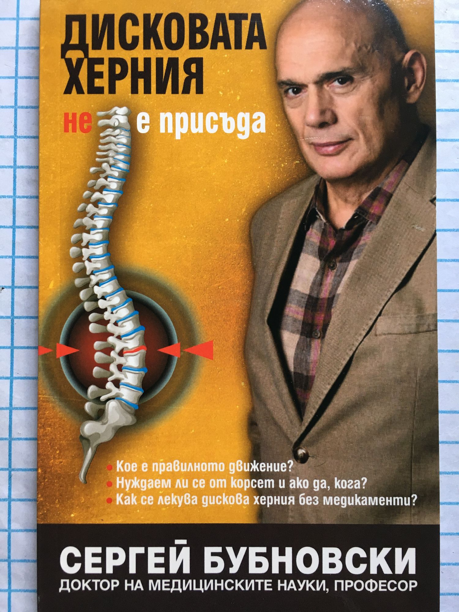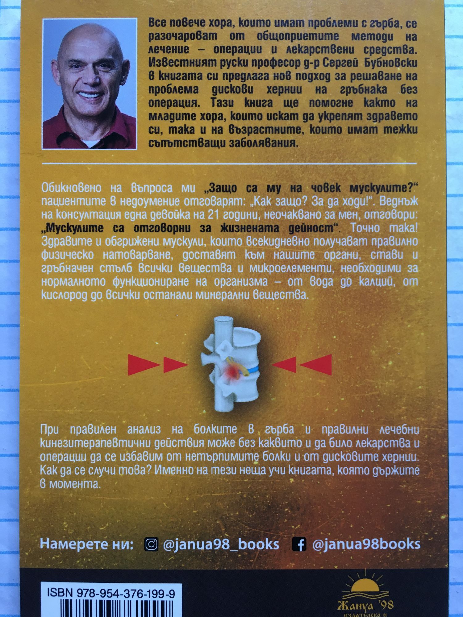 Все повече хора, които имат проблеми с гърба, се разочароват от общоприетите методи на лечение - операции и лекарствени средства. Известният руски професор д-р Сергей Бубновски в книгата си предлага нов подход за решаване на проблема дискови хернии на гръбнака без операция. Тази книга ще помогне както на младите хора, които искат да укрепят здравето си, така и на възрастните, които имат тежки съпътстващи заболявания. Обикновено на въпроса ми „Защо са му на човек мускулите?“ пациентите в недоумение отговарят: „Как защо? За да ходи!“. Веднъж на консултация една девойка на 21 години, неочаквано за мен, отговори: „Мускулите са отговорни за жизнената дейност“. Точно така! Здравите и обгрижени мускули, които всекидневно получават правилно физическо натоварване, доставят към нашите органи, стави и гръбначен стълб всички вещества и микроелементи, необходими за нормалното функциониране на организма – от вода до калций, от кислород до всички останали минерални вещества. При правилен анализ на болките в гърба и правилни лечебни кинезитерапевтични действия може без каквито и да било лекарства и оперaции да се избавим от нетърпимите болки и от дисковите хернии. Как да се случи това? Именно на тези неща учи книгата, която държите в момента.