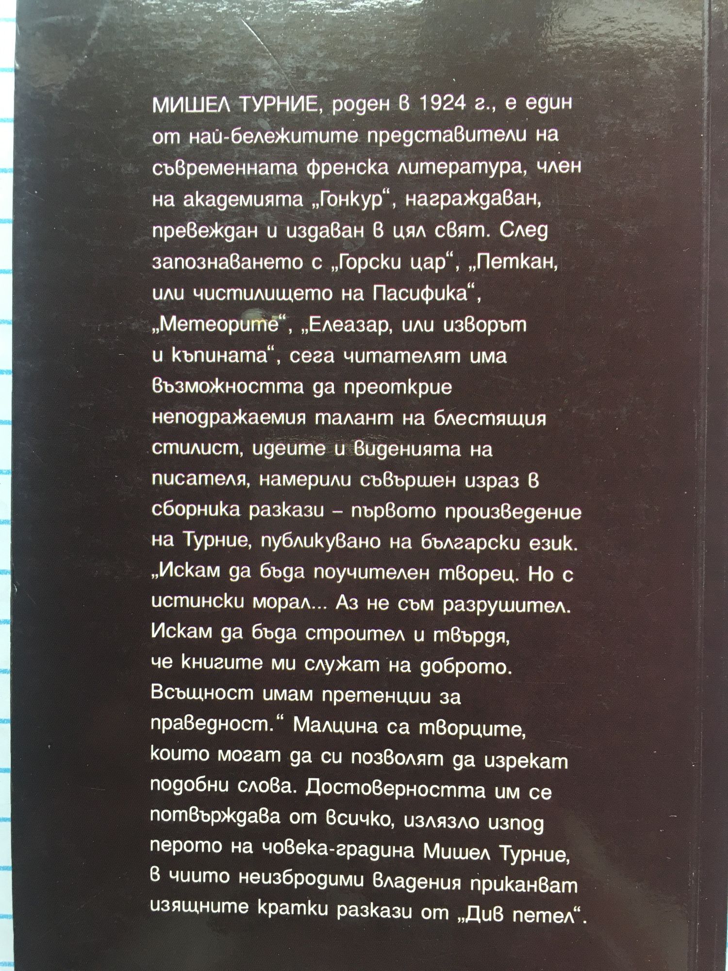 МИШЕЛ ТУРНИЕ, роден в 1924 г. е един от най-бележитите представители на съвременната френска литература, член на академията „Гонкур", награждаван, превеждан и издаван в цял свят. След запознаването с „Горски цар", „Петкан, или чистилището на Пасифика", „Метеорите", „Елеазар, или изворът и къпината", сега читателят има възможността да преоткрие неподражаемия талант на блестящия стилист, идеите и виденията на писателя, намерили съвършен израз в сборника разкази - първото произведение на Турние, публикувано на български език. „Искам да бъда поучителен творец. Но с истински морал... Аз не съм разрушител. Искам да бъда строител и твърдя, че книгите ми служат на доброто. Всъщност имам претенции за праведност." Малцина са творците, които могат да си позволят да изрекат подобни слова. Достоверността им се потвърждава от всичко, излязло изпод перото на човека-градина Мишел Турние, в чиито неизбродими владения приканват изящните кратки разкази от „Див петел".