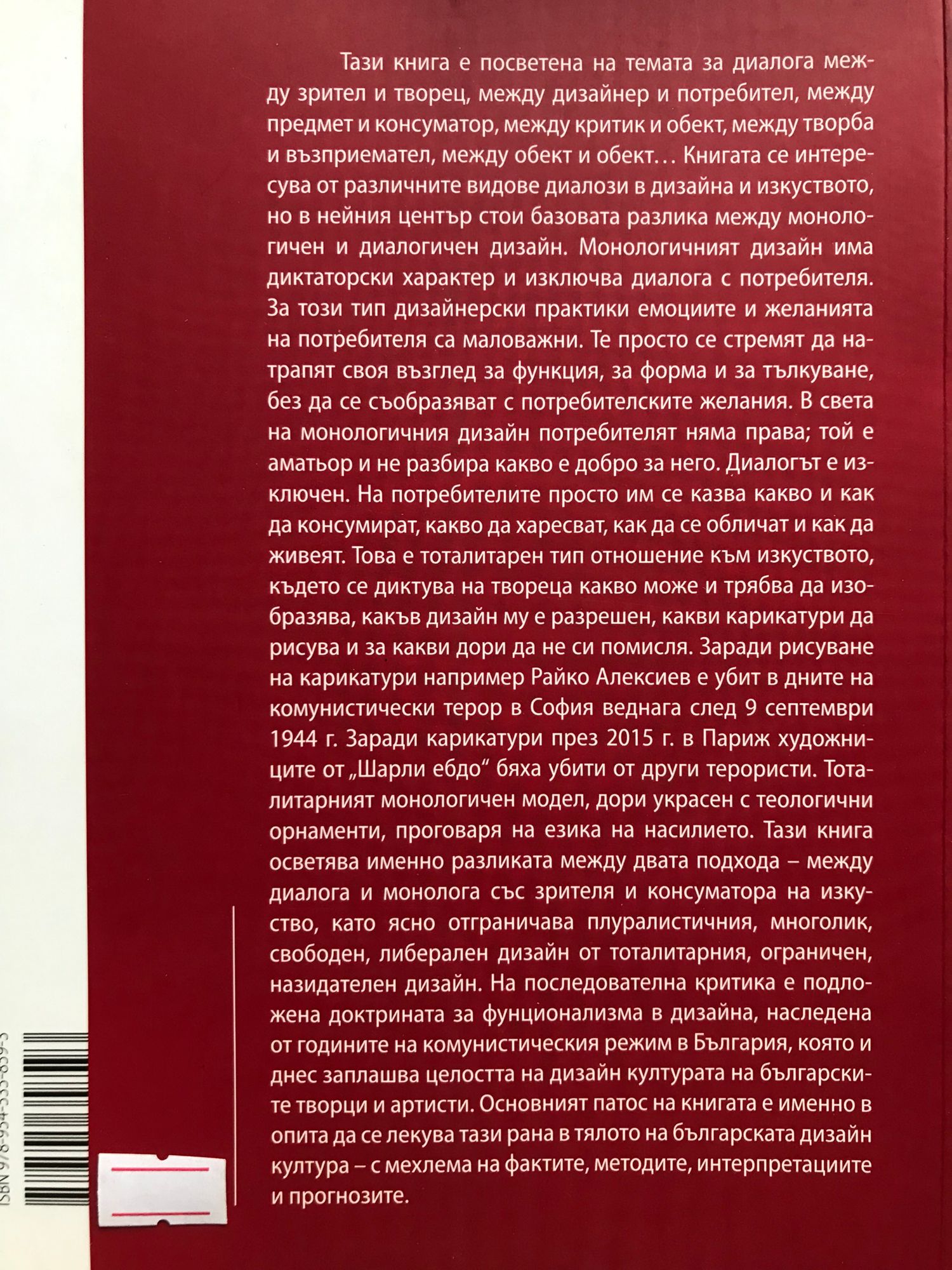 Тази книга е посветена на темата за диалога между зрител и творец, между дизайнер и потребител, между предмет и консуматор, между критик и обект между творба и възприемател, между обект и обект... Книгата се интересува от различните видове диалози в дизайна и изкуството, но в нейния център стои базовата разлика между монологичен и диалогичен дизайн. Монологичният дизайн има диктаторски характер и изключва диалога с потребителя. За този тип дизайнерски практики емоциите и желанията на потребителя са маловажни. Те просто се стремят да натрапят своя възглед за функция, за форма и за тълкуване, без да се съобразяват с потребителските желания. В света на монологичния дизайн потребителят няма права; той е аматьор и не разбира какво е добро за него. Диалогът е изключен. На потребителите просто им се казва какво и как да консумират, какво да харесват, как да се обличат и как да живеят. Това е тоталитарен тип отношение към изкуството, където се диктува на твореца какво може и трябва да изобразява, какъв дизайн му е разрешен, какви карикатури да рисува и за какви дори да не си помисля. Заради рисуване на карикатури например Райко Алексиев е убит в дните на комунистически терор в София веднага след 9 септември 1944 г. Заради карикатури през 2015 г. в Париж художниците от "Шарли ебдо" бяха убити от други терористи. Тоталитарният монологичен модел, дори украсен с теологични орнаменти, проговаря на езика на насилието. Тази книга осветява именно разликата между двата подхода - между диалога и монолога със зрителя и консуматора на изкуство, като ясно ограничава плуралистичния, многолик, свободен, либерален дизайн от тоталитарния, ограничен, назидателен дизайн. На последователна критика е подложена доктрината за функционализма в дизайна, наследена от годините на комунистическия режим в България, която и днес заплашва целостта на дизайн културата на българските творци и артисти. Основният патос на книгата е именно в опита да се лекува тази рана в тялото на българската дизайн култура - с мехлема на фактите, методите, интерпретациите и прогнозите.