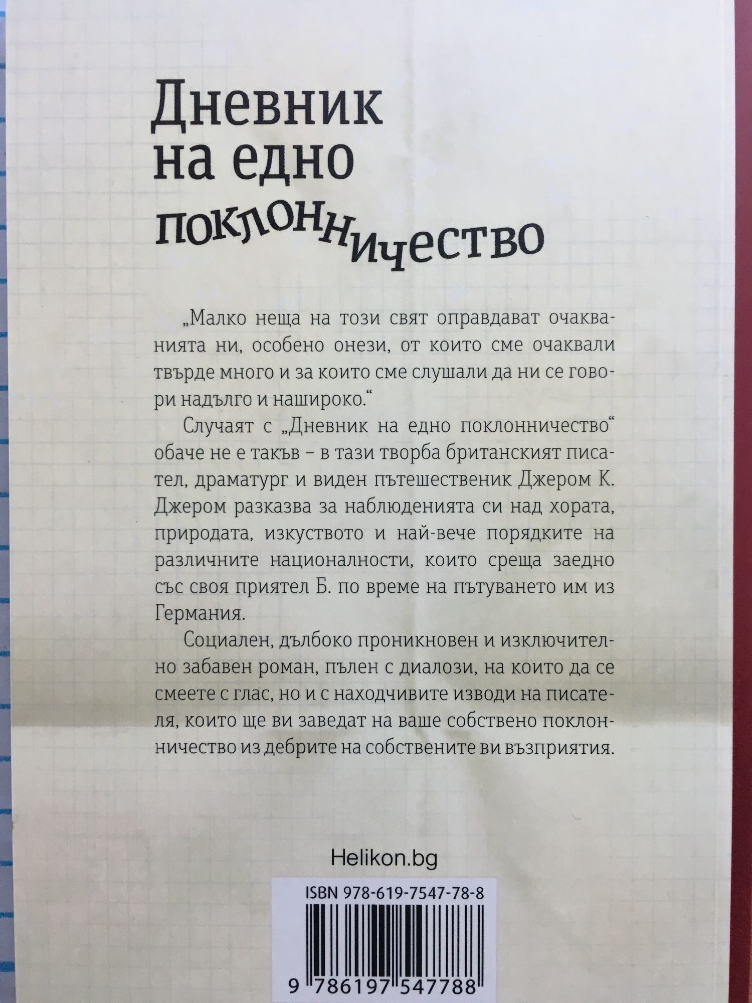 „Малко неща на този свят оправдават очакванията ни, особено онези, от които сме очаквали твърде много и за които сме слушали да ни се говори надълго и нашироко.“ Случаят с ‚Дневник на едно поклонничество“ обаче не е такъв – в тази творба британският писател, драматург и виден пътешественик Джером К. Джером разказва за наблюденията си над хората, природата, изкуството и най-вече порядките на различните националности, които среща заедно със своя приятел Б. по време на поклонничеството им из Германия. Социален, дълбоко проникновен и изключително забавен роман, пълен с диалози, на които да се смеете с глас, но и с находчивите изводи на писателя, които ще ви заведат на ваше собствено поклонничество из дебрите на собствените ви възприятия.