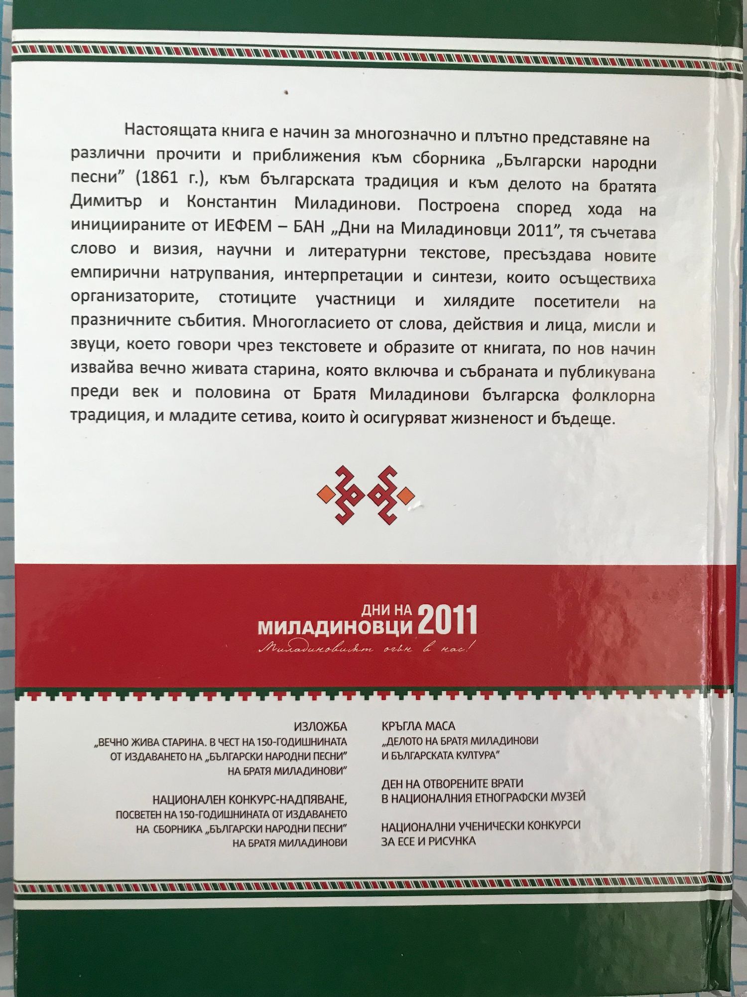 Настоящата книга е начин за многоезично и плътно представяне на различни прочити и приближения към сборника "Български народни песни" (1861 г.), към българската традиция и към делото на братята Димитър и Константин Миладинови. Построена според хода на инициираните от ИЕФЕМ – БАН "Дни на Миладиновци 2012", тя съчетава слово и визия, научни и литературни текстове, пресъздава новите емпирични натрупвания, интерпретации и синтези, които осъществиха организаторите, стотиците участници и хилядите посетители на празничните събития. Многогласието от слова, действия и лица, мисли и звуци, което говори чрез текстовете и образите от книгата, по нов начин извайва вечно живата старина, която включва и събраната и публикувана преди век и половина от Братя Миладинови българска фолклорна традиция, и младите сетива, които и осигуряват жизненост и бъдеще.
