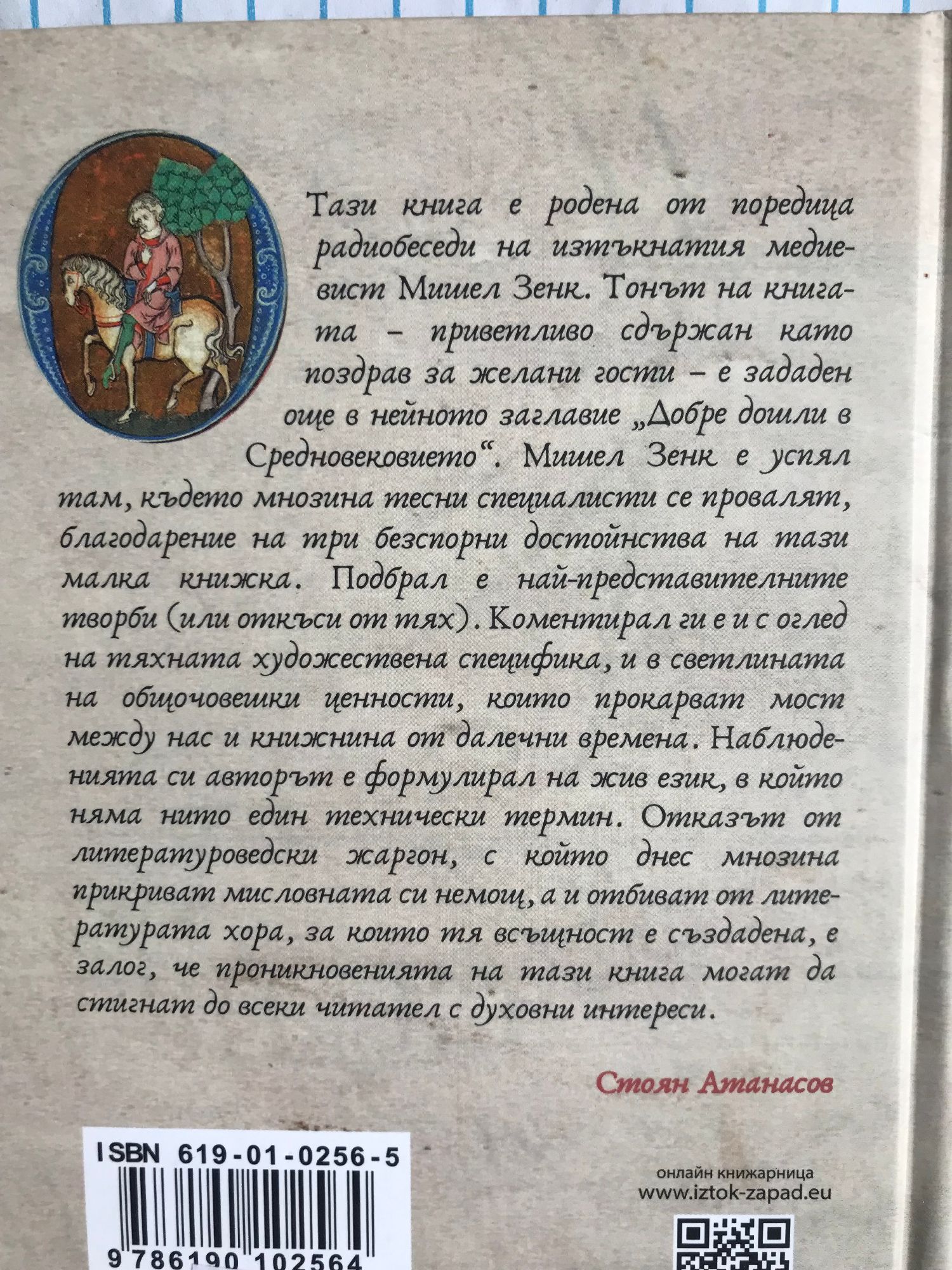 "Тази книга е родена от поредица радиобеседи на изтъкнатия медиевист Мишел Зенк. Тонът на книгата - приветливо сдържан като поздрав за желани гости - е зададен още в нейното заглавие "Добре дошли в Средновековието". Мишел Зенк е успял там, където мнозина тесни специалисти се провалят, благодарение на три безспорни достойнства на тази малка книжка. Подбрал е най-представителните творби (или откъси от тях). Коментирал ги е и с оглед на тяхната художествена специфика, и в светлината на общочовешки ценности, които прокарват мост между нас и книжнина от далечни времена. Наблюденията си авторът е формулирал на жив език, в който няма нито един технически термин. Отказът от литературоведски жаргон, с който днес мнозина прикриват мисловната си немощ, а и отбиват от литературата хора, за които тя всъщност е създадена, е залог, че проникновенията на тази книга могат да стигнат до всеки читател с духовни интереси.