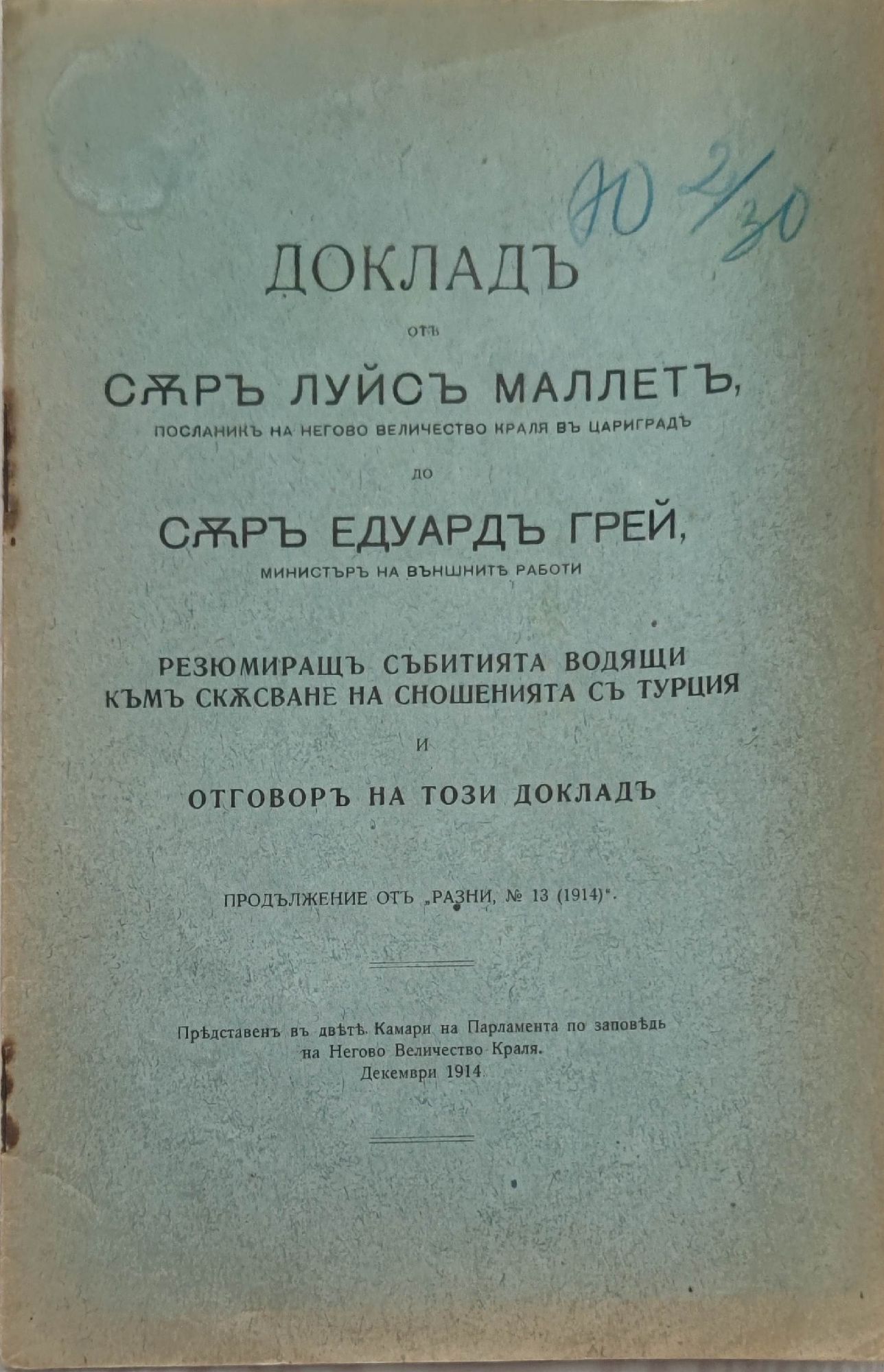 Докладъ отъ съръ Луйсъ Маллетъ, посланикъ на негово величество краля въ Цариградъ до съръ Едуардъ Грей, министъръ на външните работи