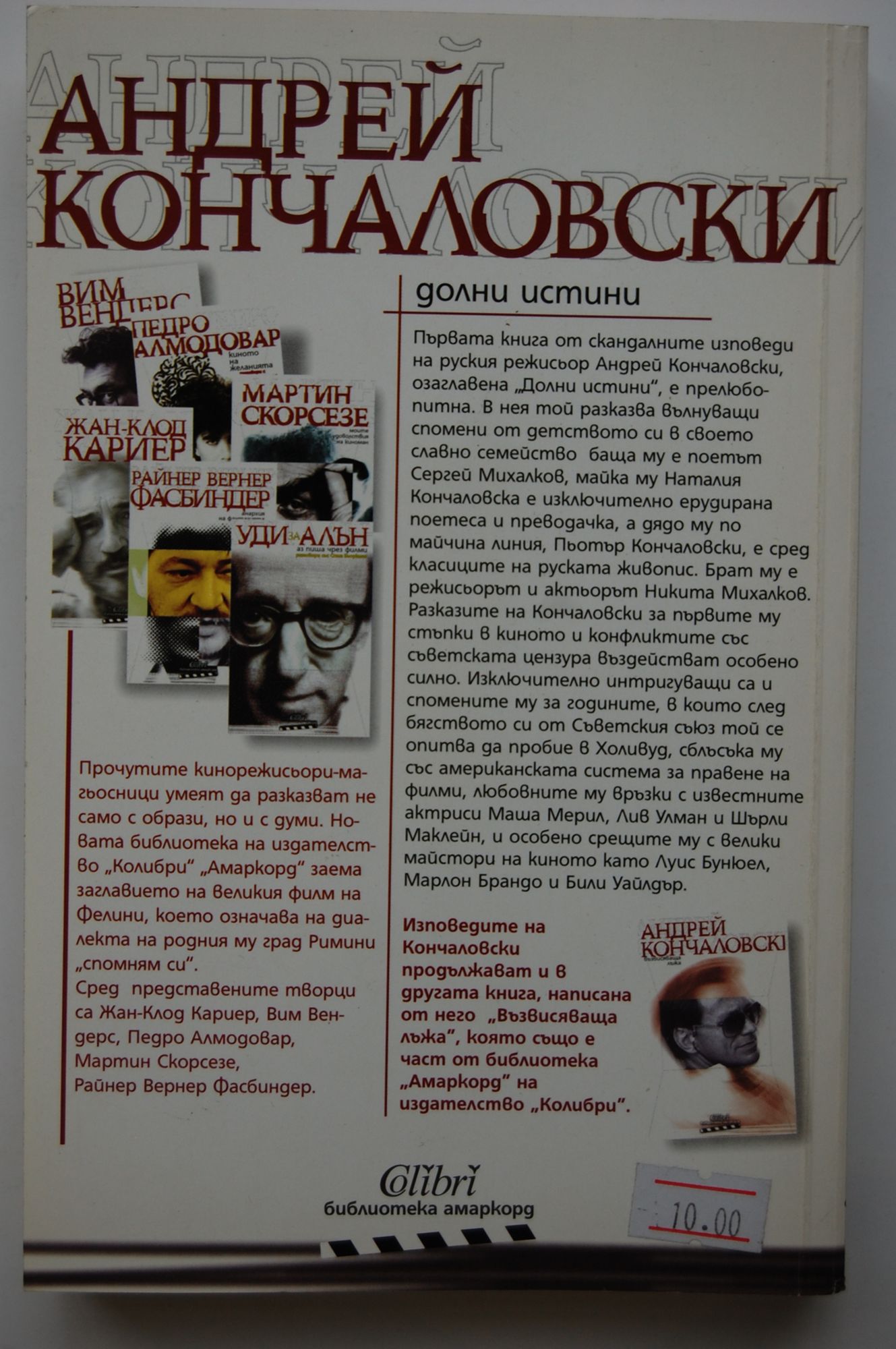 Първата книга от скандалните изпoвegu на руския режисьор Андрей Кончаловски, озаглавена „Долни истини", е прелюбоnumна. В нея той разказва вълнуващи спомени от детството си в своето славно семейство баща му е поетът Сергей Михалков, майка му Наталия Кончаловска е изключително ерудирана noemeca u npeвogaчka, a gяgo my no майчина линия, Пьотър Кончаловски, е сред класиците на руската живопис. Брат му е peжисъopъm u akmbopom Hukuma Muxaлков. Разказите на Кончаловски за първите му стьnku в киното u kонфлиkmume със съветската цензура въздействат особено силно. Изключително интригуващи са и спомените му за годините, в които след бягството си от Съветския съюз той се onumва да пробие в Холивуд, сблъсъка му със американската система за правене на филми, любовните му връзки с известните akmрucu Маша Мерил, Лив Улман и Шърли Makлейн, и особено срещите му с Велики майстори на киното kamo Луис Бунюел, Марлон Брандо и Били Уайлдър.