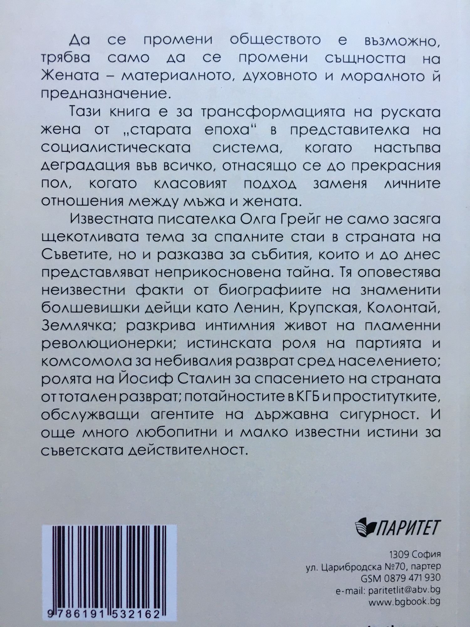 Да се промени обществото е възможно, трябва само да се промени същността на Жената - материалното, духовното и моралното й предназначение. Тази книга е за трансформацията на руската жена от „старата епоха" в представителка на социалистическата система, когато настъпва деградация във всичко, отнасящо се до прекрасния пол, когато класовият подход заменя личните отношения между мъжа и жената. Известната писателка Олга Грейг не само засяга щекотливата тема за спалните стаи в страната на Съветите, но и разказва за събития, които и до днес представляват неприкосновена тайна. Тя оповестява неизвестни факти от биографиите на знаменити болшевишки дейци като Ленин, Крупская, Колонтай, Землячка; разкрива интимния живот на пламенни революционерки; истинската роля на партията и комсомола за небивалия разврат сред населението; ролята на Йосиф Сталин за спасението на страната от тотален разврат; потайностите в КГБ и проститутките, обслужващи агентите на държавна сигурност. И още много любопитни и малко известни истини за съветската действителност.