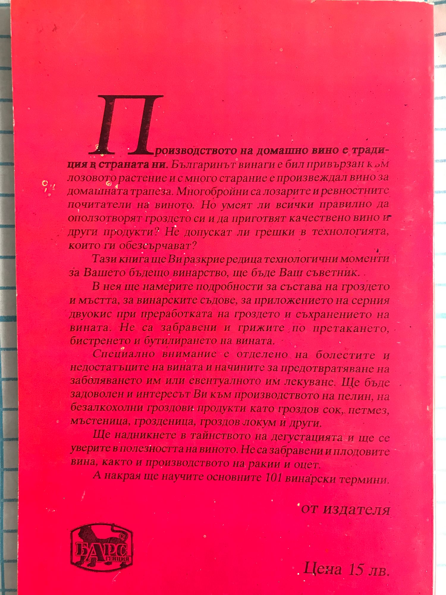 Тази книга ще ви разкрие технологичните моменти за вашето бъдещо винарство, ще бъде ваш съветник. От нея ще научите за състава на гроздето и мъстта, за винарските съдове, за приложението на серния диоксид при преработката на гроздето и съхранението на вината, за грижите по претакането, бистренето и бутилирането на вината. Специално внимание е отделено на болестите и недостатъците на вината и начините за предотвратяване на заболяването им или евентуалното им лекуване. Ще бъде задоволен и интересът ви към производството на пелин, на безалкохолни гроздови продукти, като гроздов сок, петмез, мътеница, грозденица, гроздов локум и др. А накрая ще научите основните 101 винарски термини.