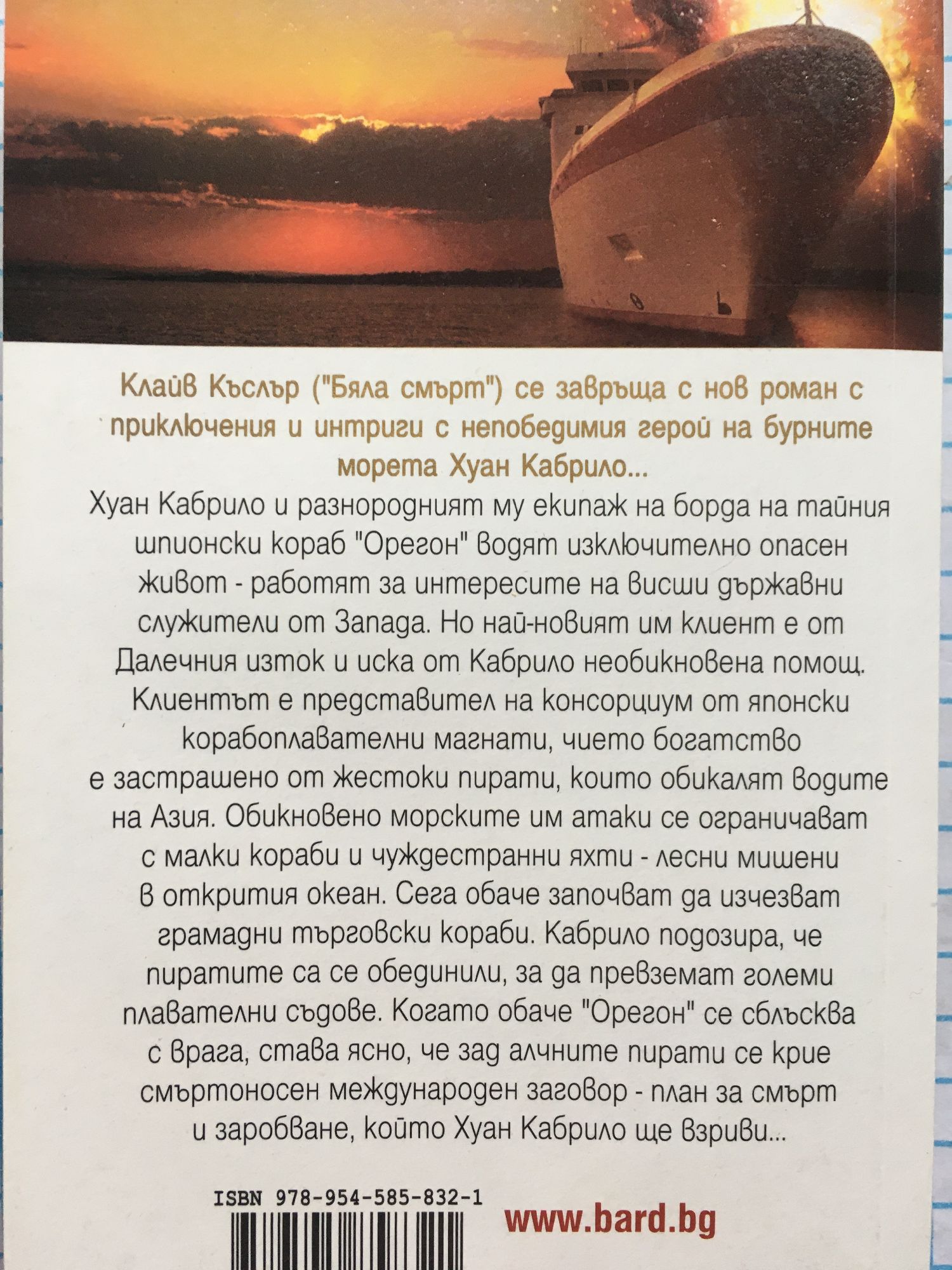 Човешки хищници плячкосват моретата. Жертвите им са безпомощни. Но Хуан Кабрило не е... Клайв Къслър (“Бяла смърт”) се завръща с нов роман с приключения и интриги с непобедимия герой на бурните морета Хуан Кабрило... Хуан Кабрило и разнородният му екипаж на борда на тайния шпионски кораб “Орегон” водят изключително опасен живот - работят за интересите на висши държавни служители от Запада. Но най-новият им клиент е от Далечния изток и иска от Кабрило необикновена помощ. Клиентът е представител на консорциум от японски корабоплавателни магнати, чието богатство е застрашено от жестоки пирати, които обикалят водите на Азия. Обикновено морските им атаки се ограничават с малки кораби и чуждестранни яхти - лесни мишени в открития океан. Сега обаче започват да изчезват грамадни търговски кораби. Кабрило подозира, че пиратите са се обединили, за да превземат големи плавателни съдове. Когато обаче “Орегон” се сблъсква с врага, става ясно, че зад алчните пирати се крие смъртоносен международен заговор - план за смърт и заробване, който Хуан Кабрило ще взриви...